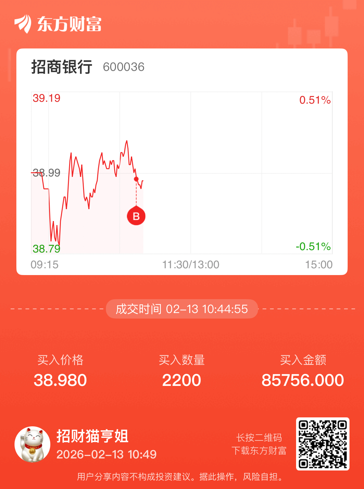 操作原因:开盘没来得及买,多花了几百块钱,长期看相差2毛钱无所谓,距离10000股的目标今年应该能实现#炒股日记# #实盘记录#