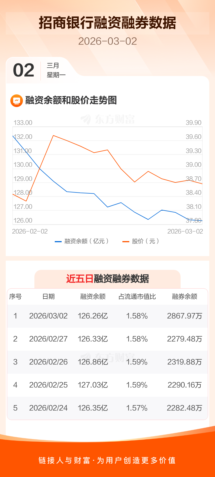 交易所最新数据显示,招商银行于2026年3月2日获融资买入2.15亿元,融资偿还2.21亿元,当日融资净偿还615.22万元。目前,该股融资余额126.26亿,占流通市值比例为1.58%。