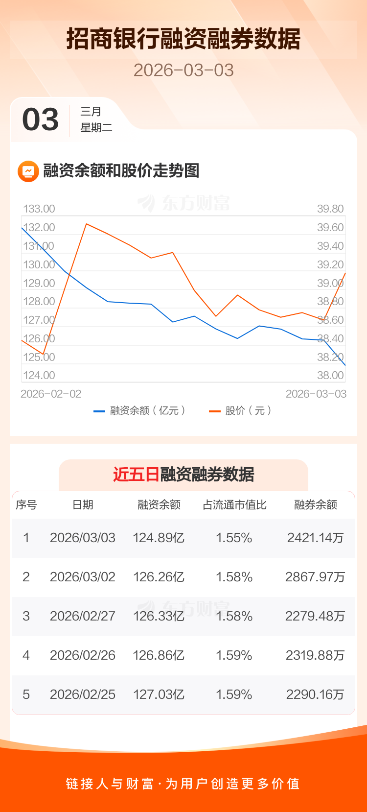 交易所最新数据显示,招商银行于2026年3月3日获融资买入2.59亿元,融资偿还3.97亿元,当日融资净偿还1.38亿元。目前,该股融资余额124.89亿,占流通市值比例为1.55%。