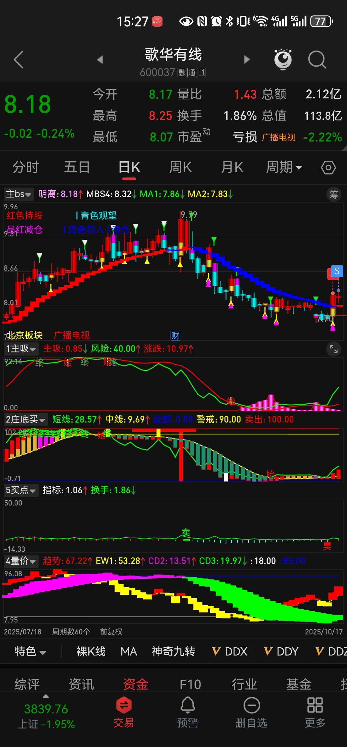$歌华有线(SH600037)$ 没有管住手,没有相信小工具,结果今天卖了(大盘指数不好看,心里就长草),不过还好,全仓六个多点进账(昨买7.80,今卖8.22)
