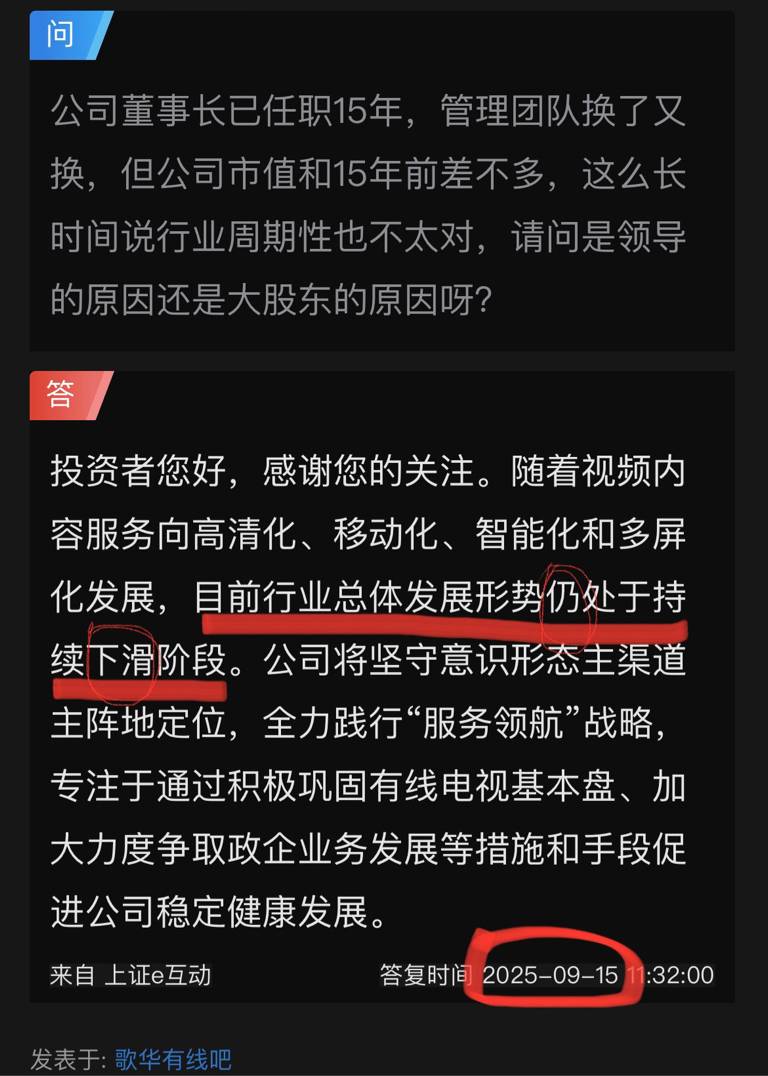 $歌华有线(SH600037)$ 歌华三季报预测!先直接说结果,亏损!你们没看错!哪怕贵广减持了也是亏损。下图标注部分就能解释为啥。读懂董秘回答问题重点,以及回答时间:看,目前行业总体发展形势仍处于持续下滑阶段。“仍”字和“下滑”,落款时间9月15日,基本是三季末,业绩盈亏基本明朗的时间段。明日盘后验证错对,本次预测不用当真,只当游戏罢了。