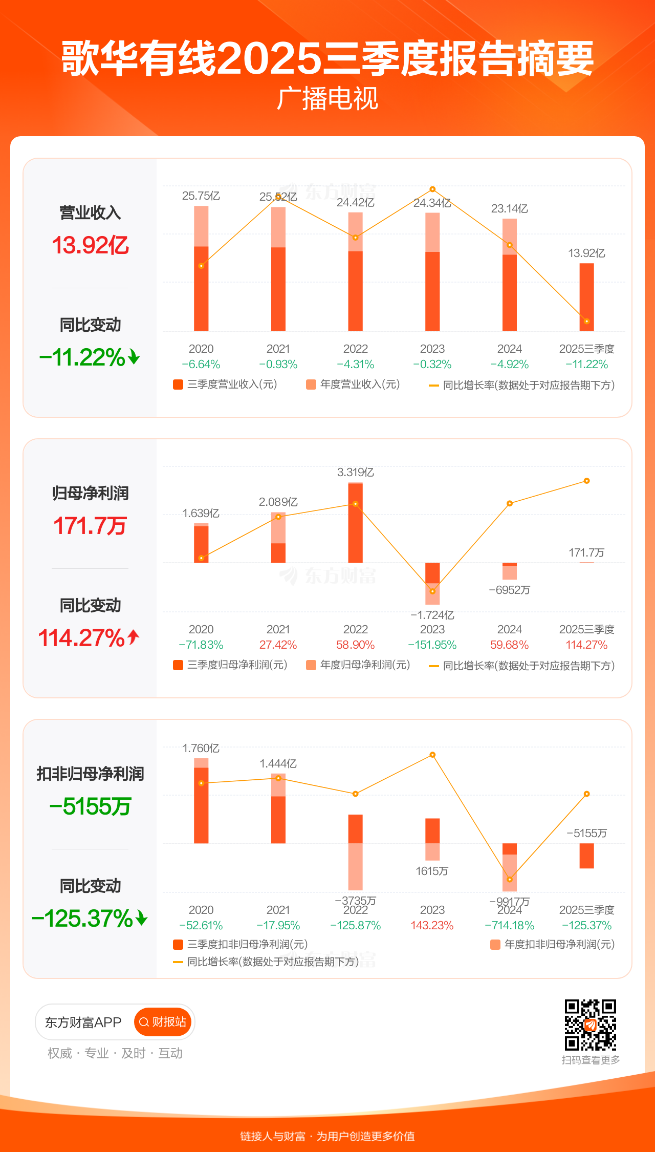 图解财报:歌华有线前三季归母净利润171.67万元,同比增长114.27%