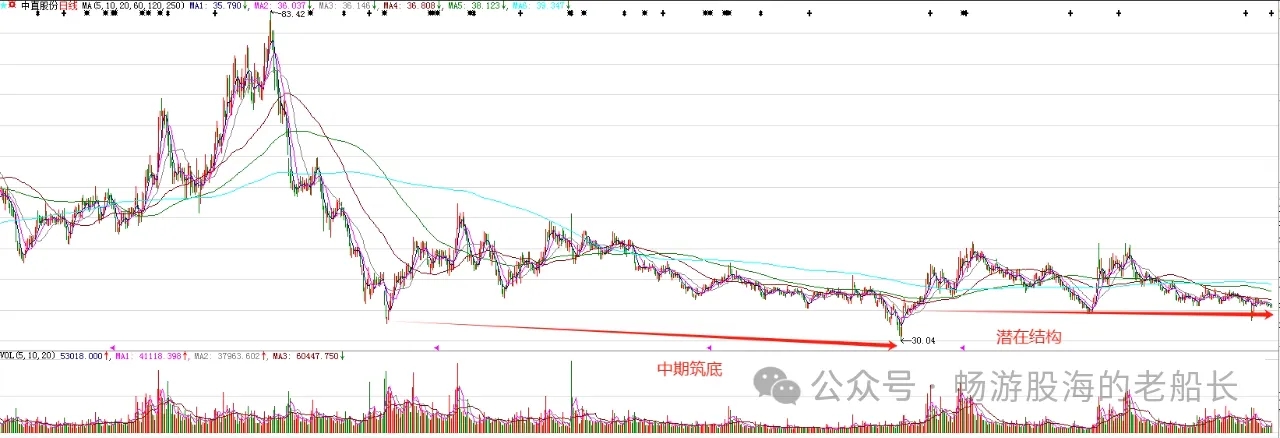 中直股份,今天冲高回落,释放了调整信号。周三股价大概率有调整。预计接下来一段时间,股价大概率在目前位置上下震荡,构筑一个潜在的双底形态。目前,日线级别的六十日均线已经走下来,所以股价调整的空间不大。图中标注的中期筑底形态已经实现了有效突破,意味着股价处在上涨趋势。现在,股价运行到了结构构筑后的末期,这是洗盘阶段。