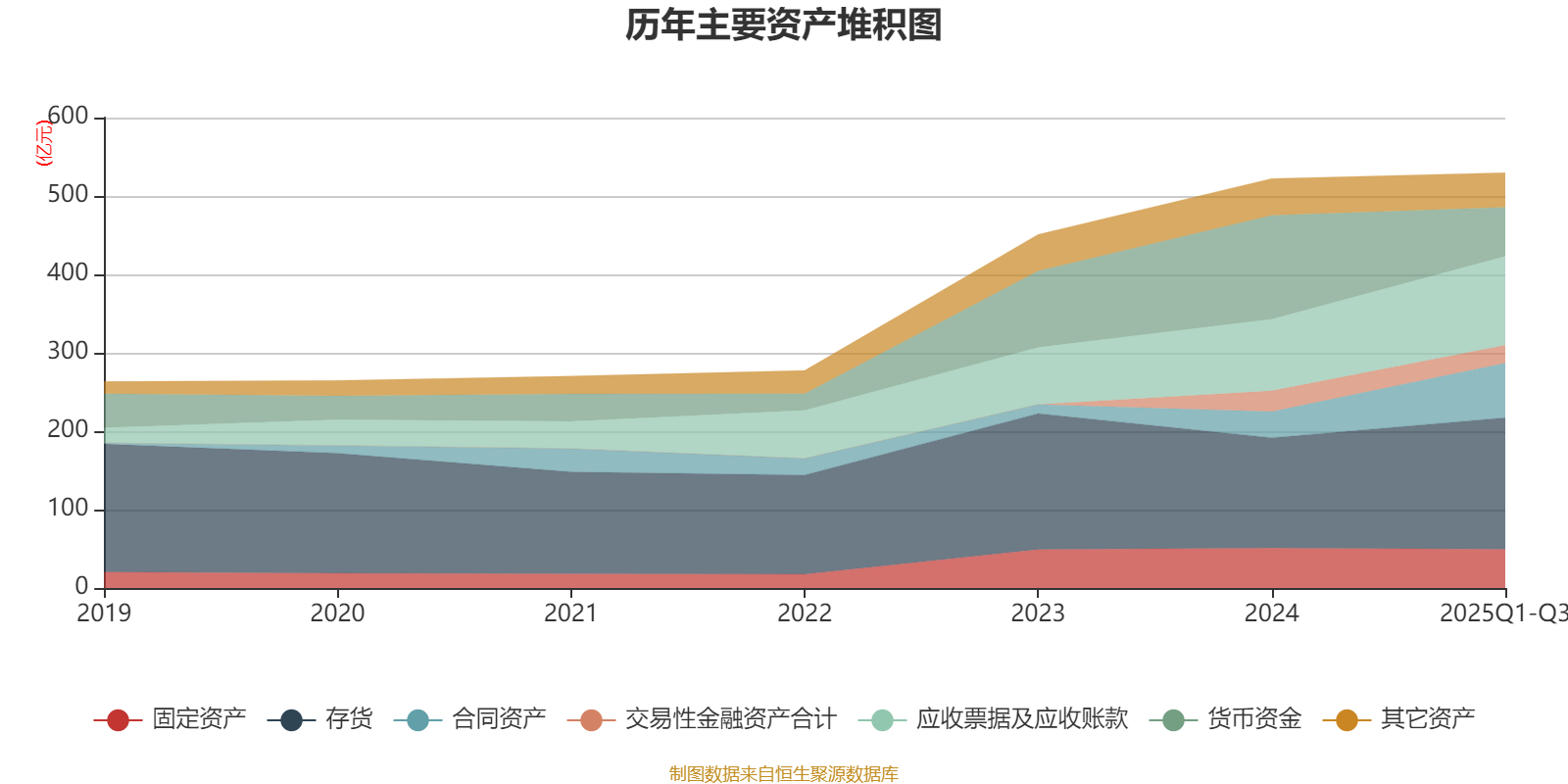 资产重大变化方面,截至2025年三季度末,公司货币资金较上年末减少52.96%,占公司总资产比重下降13.63个百分点;合同资产较上年末增加109.44%,占公司总资产比重上升6.76个百分点;存货较上年末增加19.31%,占公司总资产比重上升4.75个百分点;应收票据及应收账款较上年末增加24.1%,占公司总资产比重上升3.9个百分点。