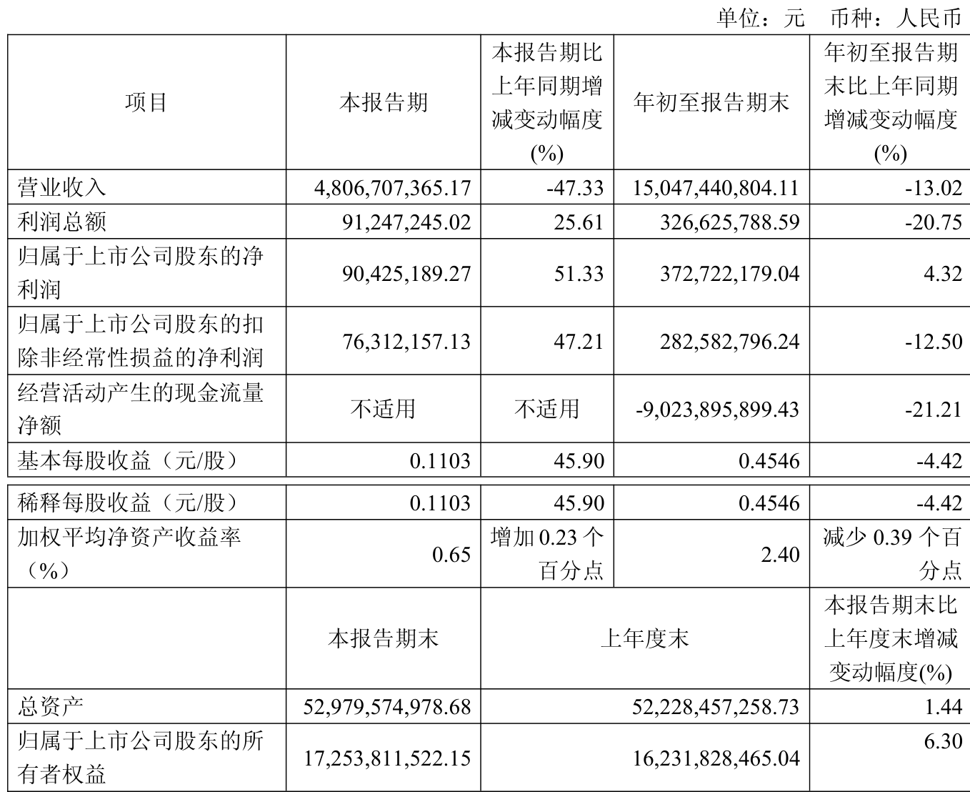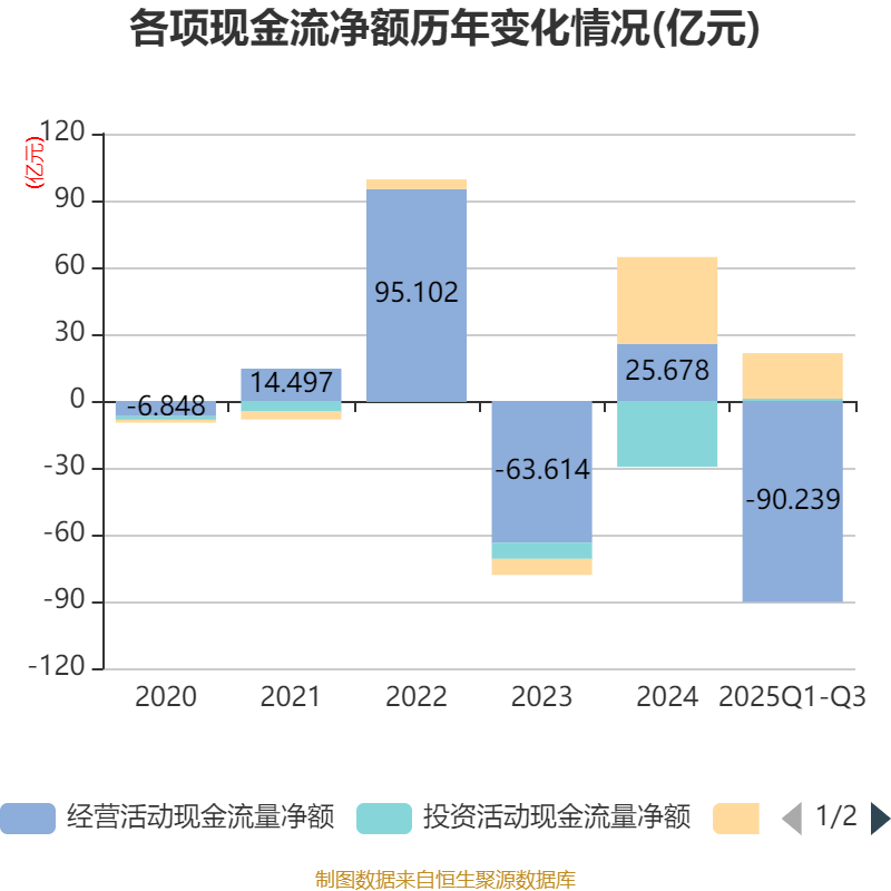 2025年前三季度,公司经营活动现金流净额为-90.24亿元,同比增加24.29亿元;筹资活动现金流净额20.47亿元,同比减少61.57亿元;投资活动现金流净额9874.44万元,上年同期为-30.62亿元。