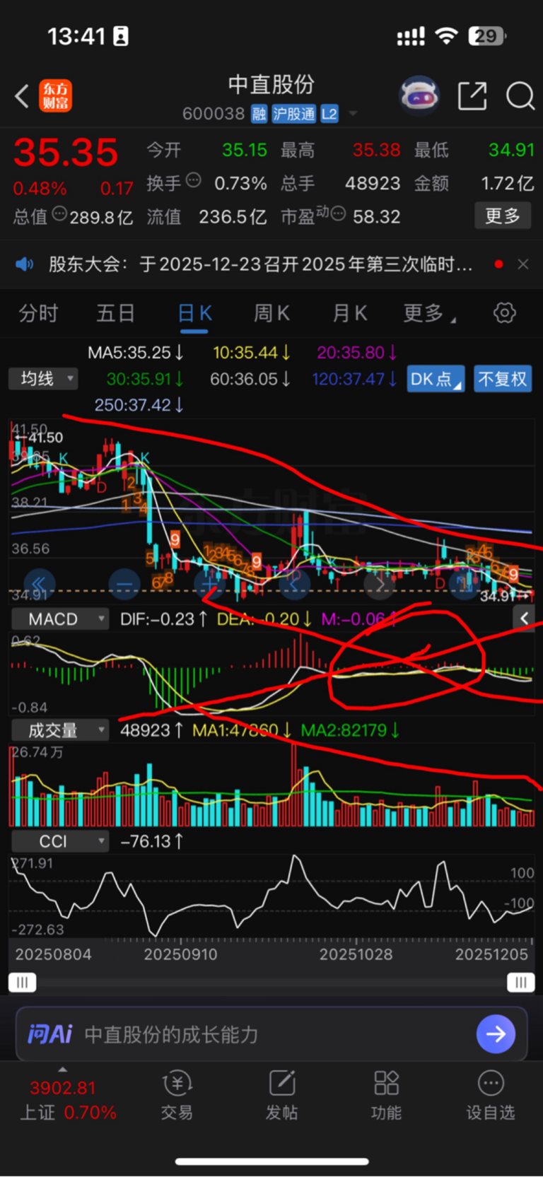 $中直股份(SH600038)$ 这个票有意思。纯交流。兄弟们可以说说自己看法。下跌趋势。空头能量减弱到多空零轴。多方减弱,空方减弱。双减弱。