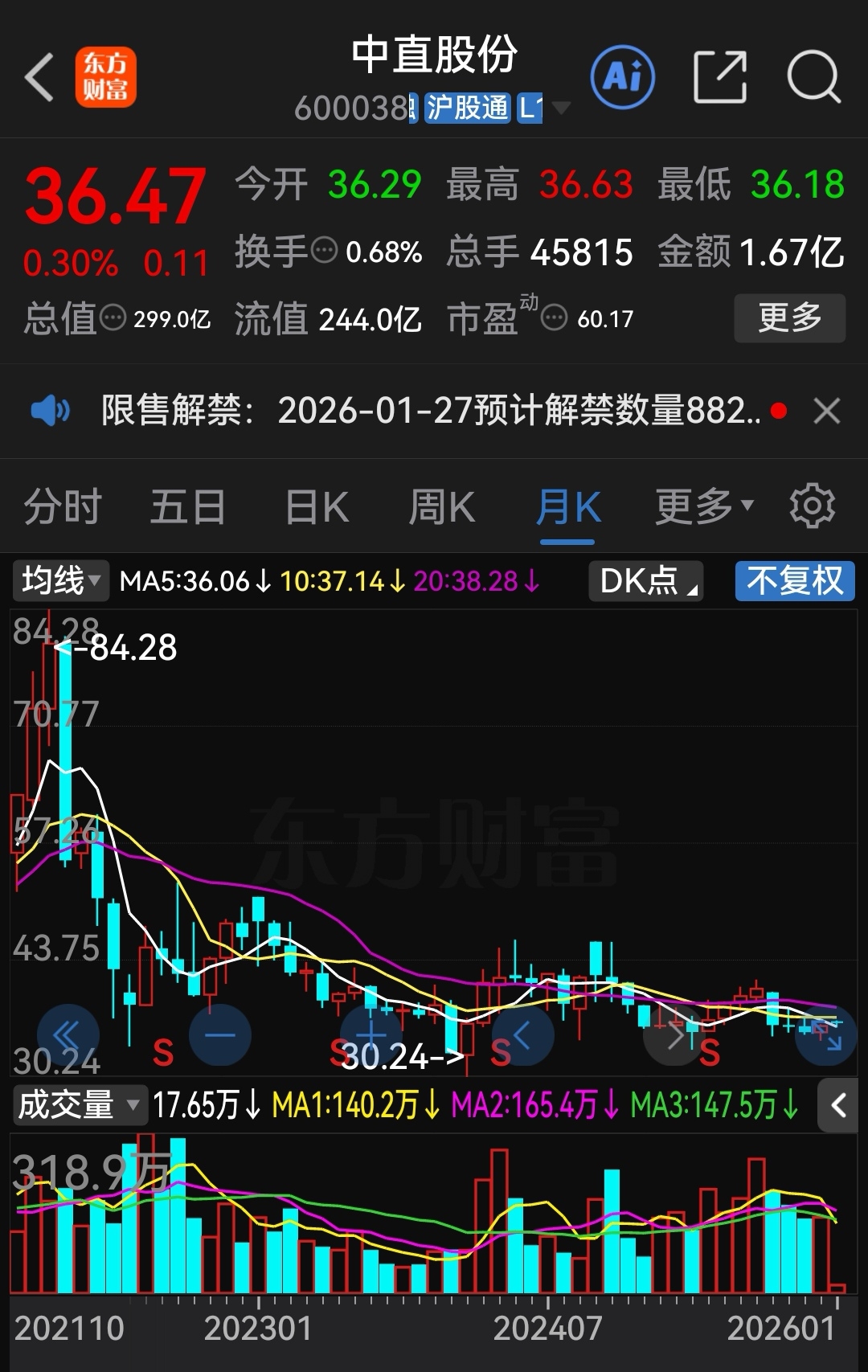 大盘4000点了,走势与大盘反着走(见下图)大盘指数一路上涨,中直股份股价一路下跌,央企市值管理!股市有风险,投资需谨慎。