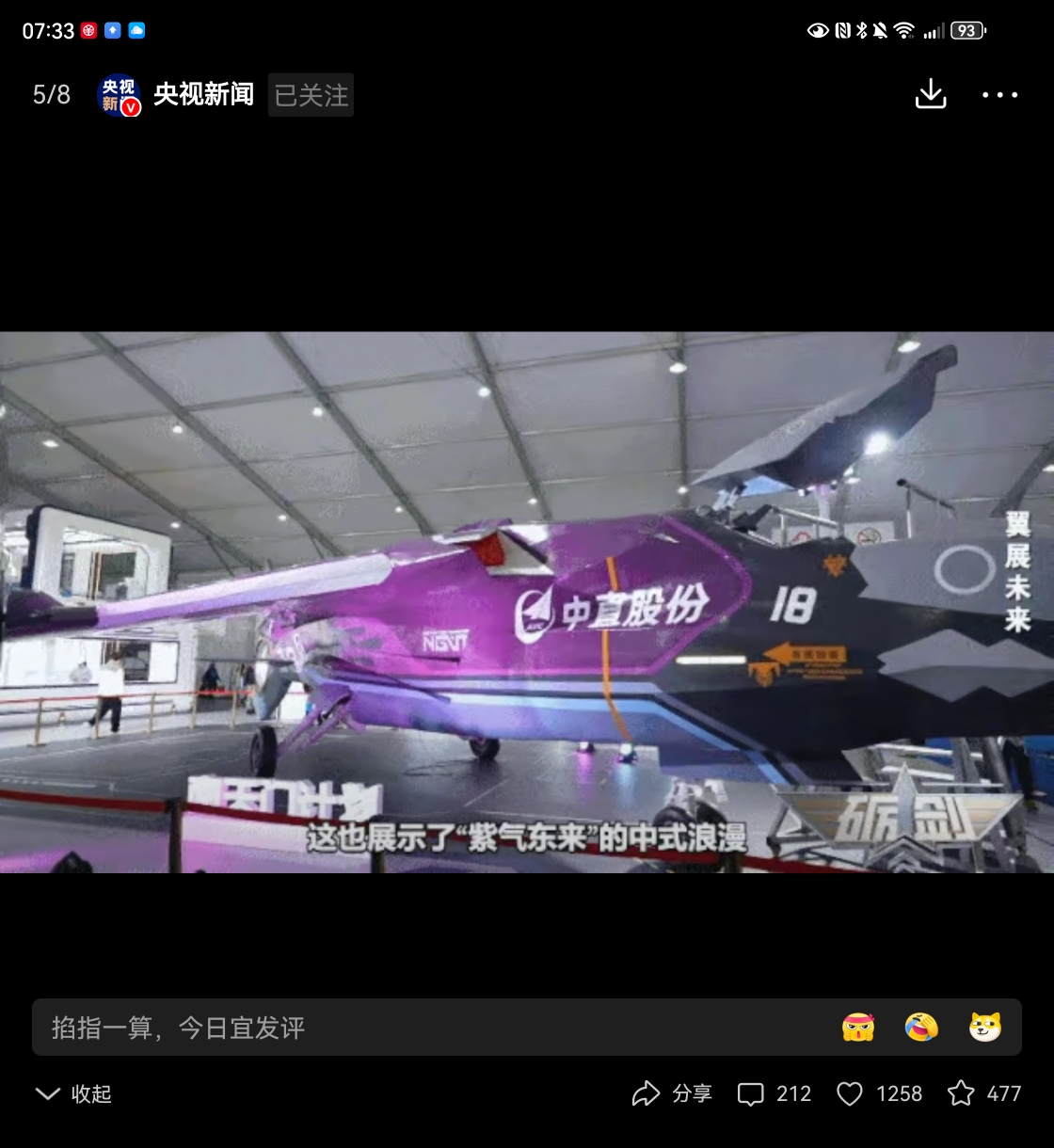 全新亮相的“紫火”通用垂直起降平台,通体泛着紫色的金属光泽,展示了“紫气东来”的中式浪漫。