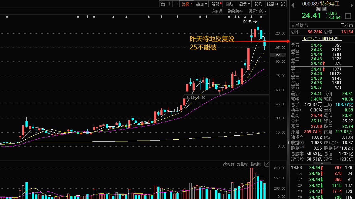特变电工600089:按照原计划,昨天都聊到不能破25也说了是极限,这个时候就没有什么好犹豫的了,破了就容易震荡,这种不确定性的阶段是不适合持有的。特变有固态变压器概念也有业绩增长。