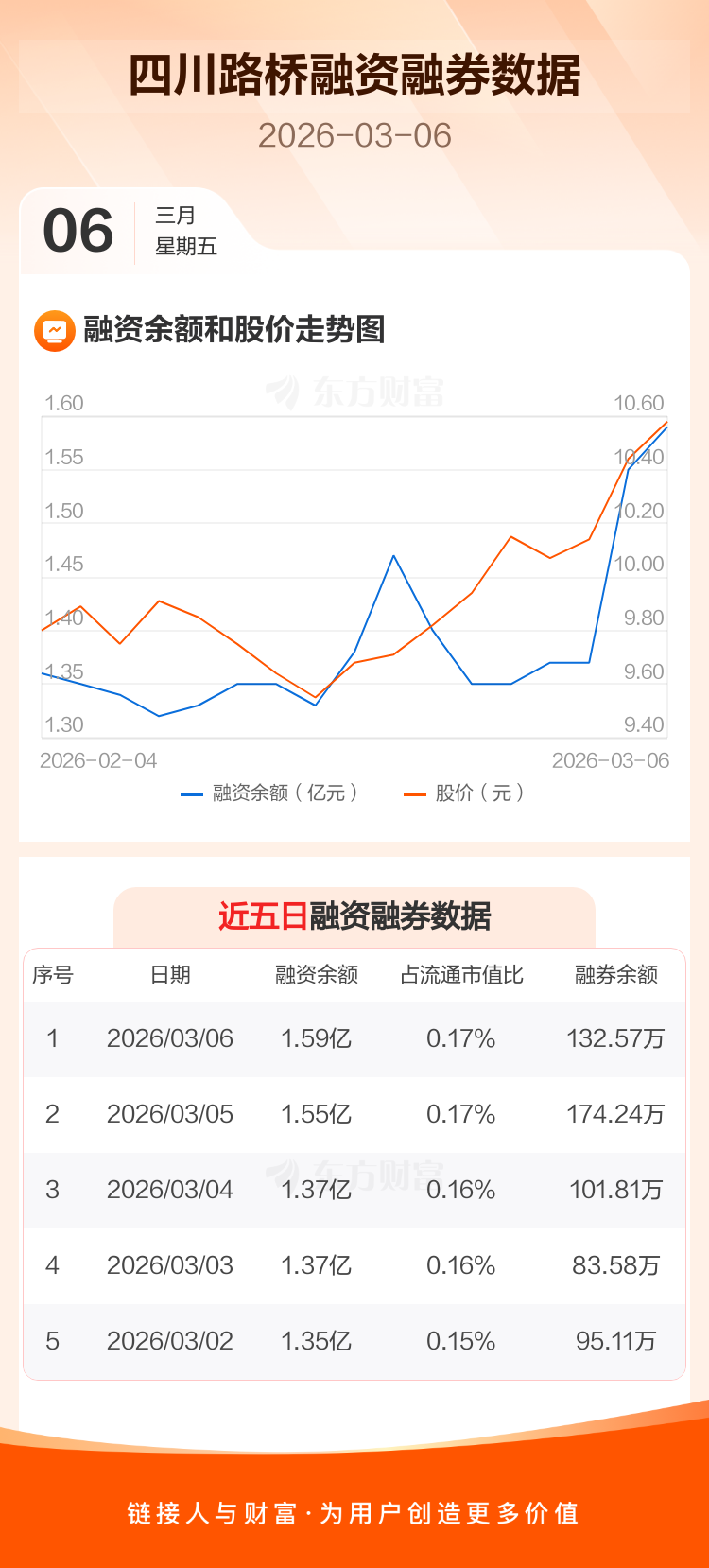 交易所最新数据显示,四川路桥于2026年3月6日获融资买入1586.50万元,融资偿还1194.02万元,当日融资净买入392.48万元。目前,该股融资余额1.59亿,占流通市值比例为0.17%。