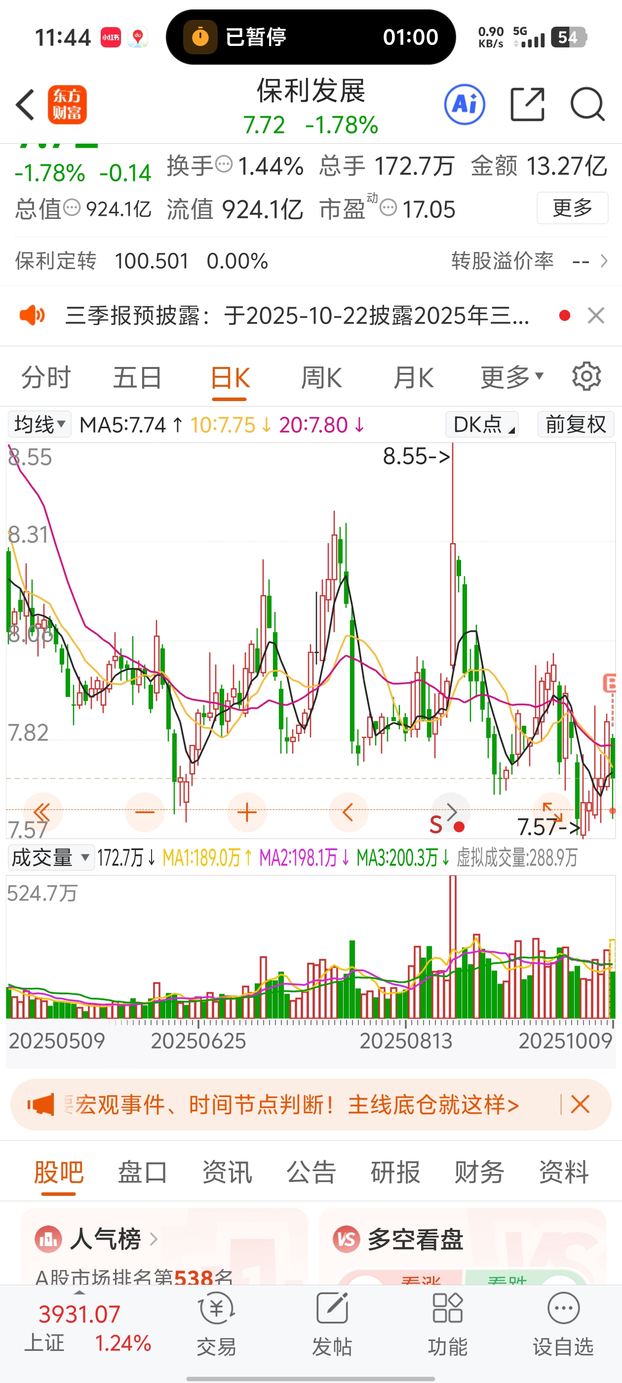 $保利发展(SH600048)$ 清心寡欲一个国庆,今天择机插进来了