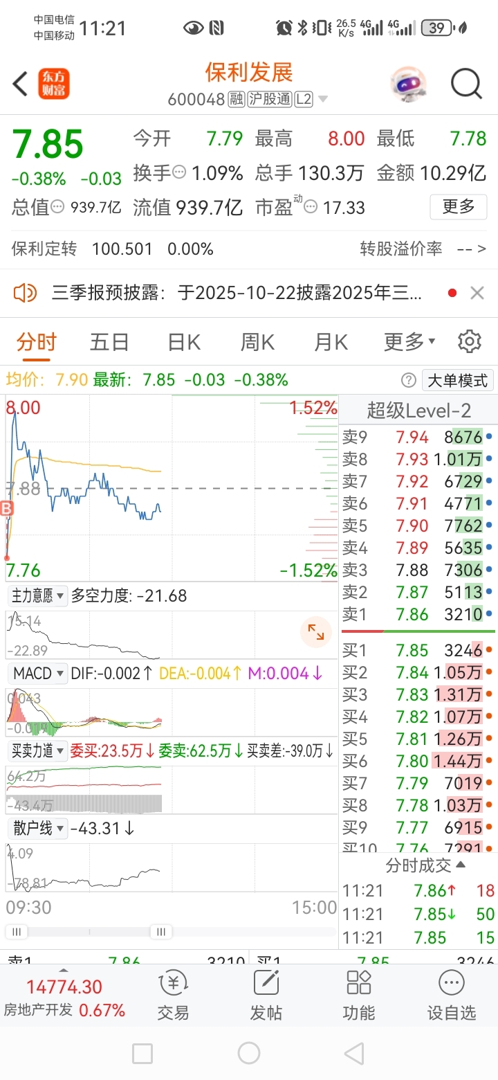 $保利发展(SH600048)$ 把昨天尾盘减的,今天加了回来。