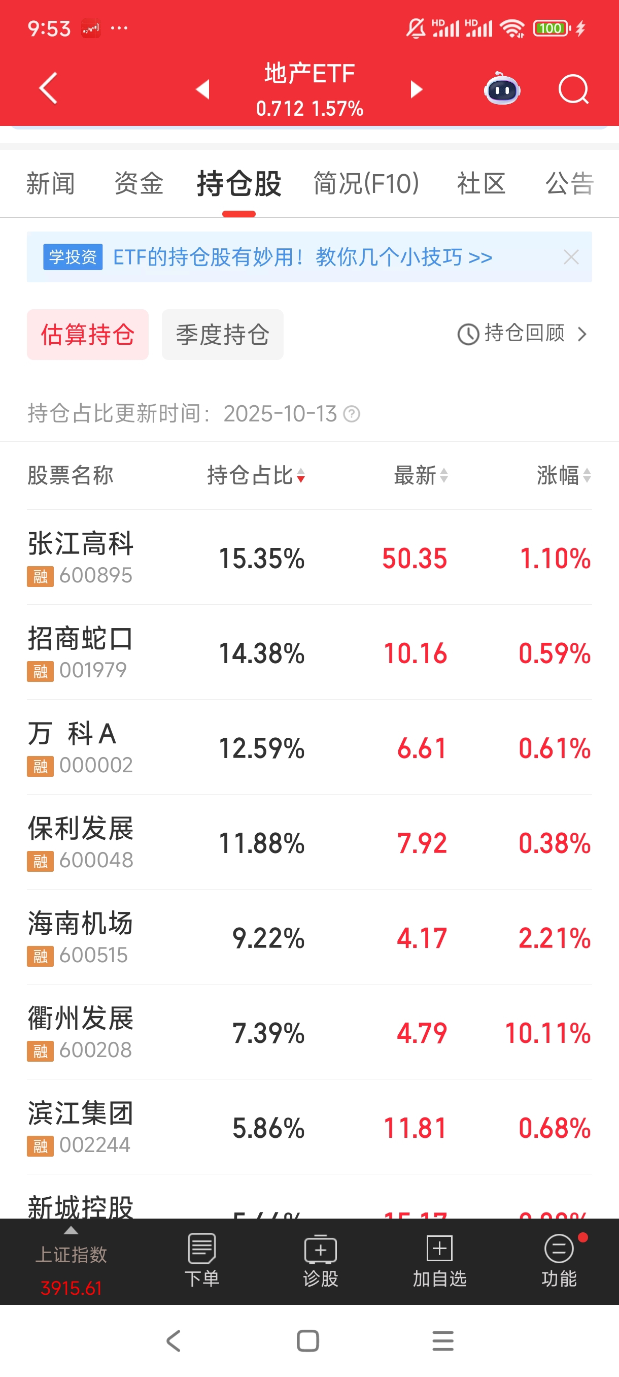 $保利发展(SH600048)$ 讲个笑话:地产etf占比最高的是张江高科,保利发展排第四。提示:这东西是每个季度之前按市值比例配置的
