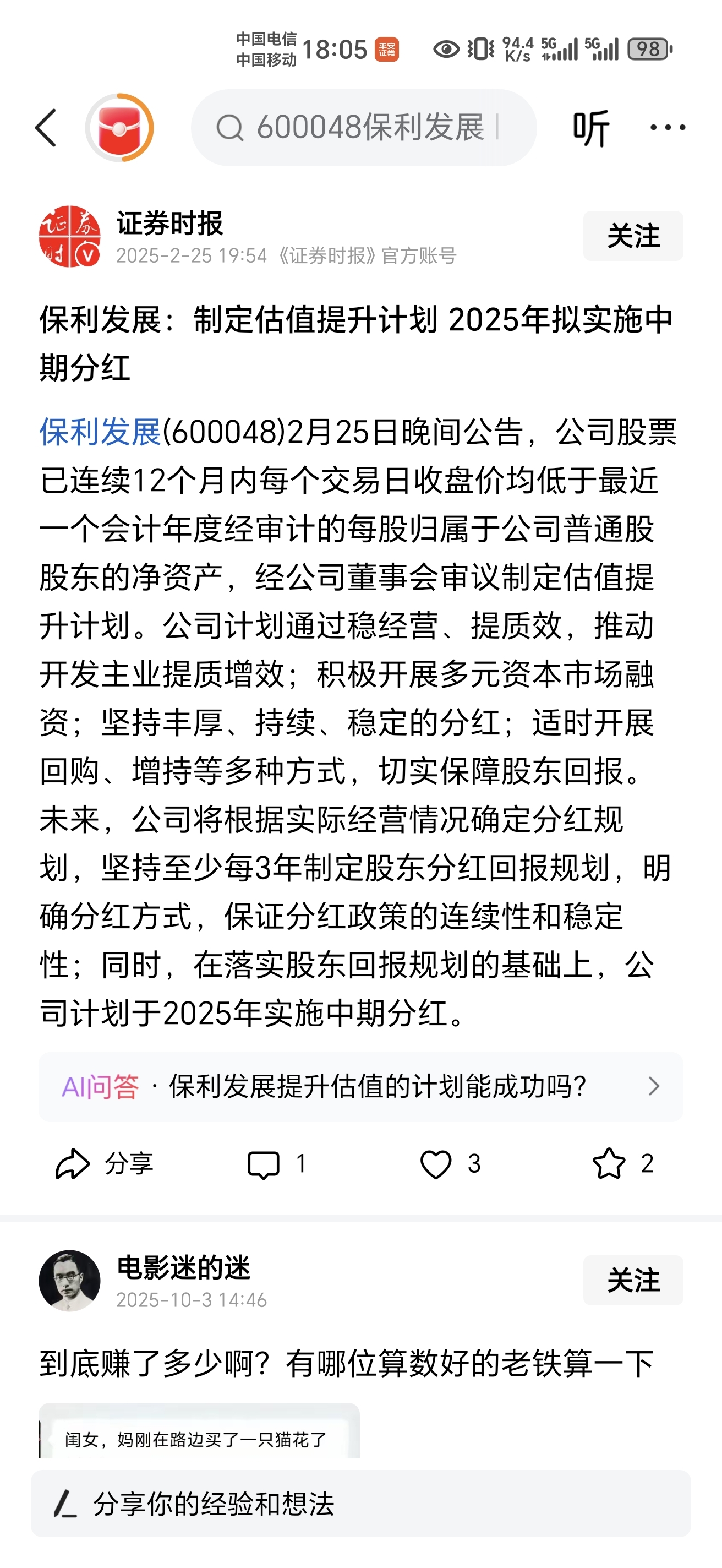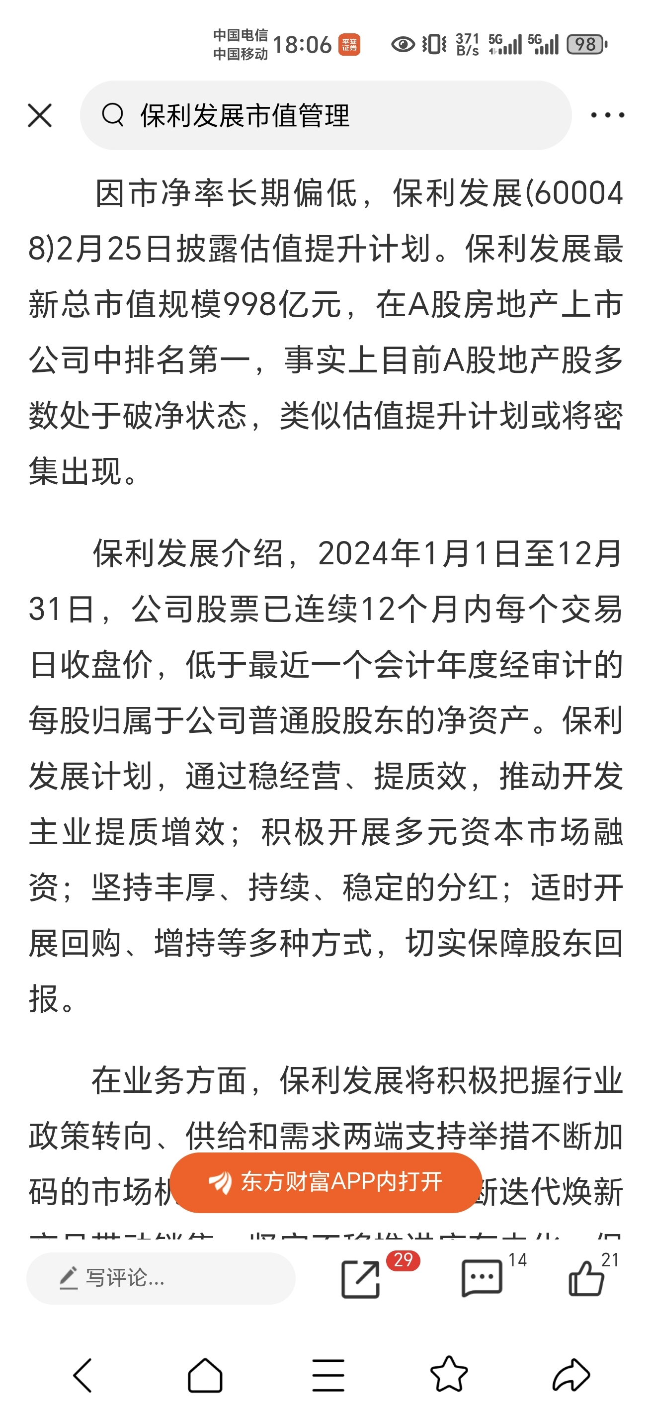 保利发展这种欺诈公司都有人买,真不知道散户是怎么想的,2月25号发布市值管理当时