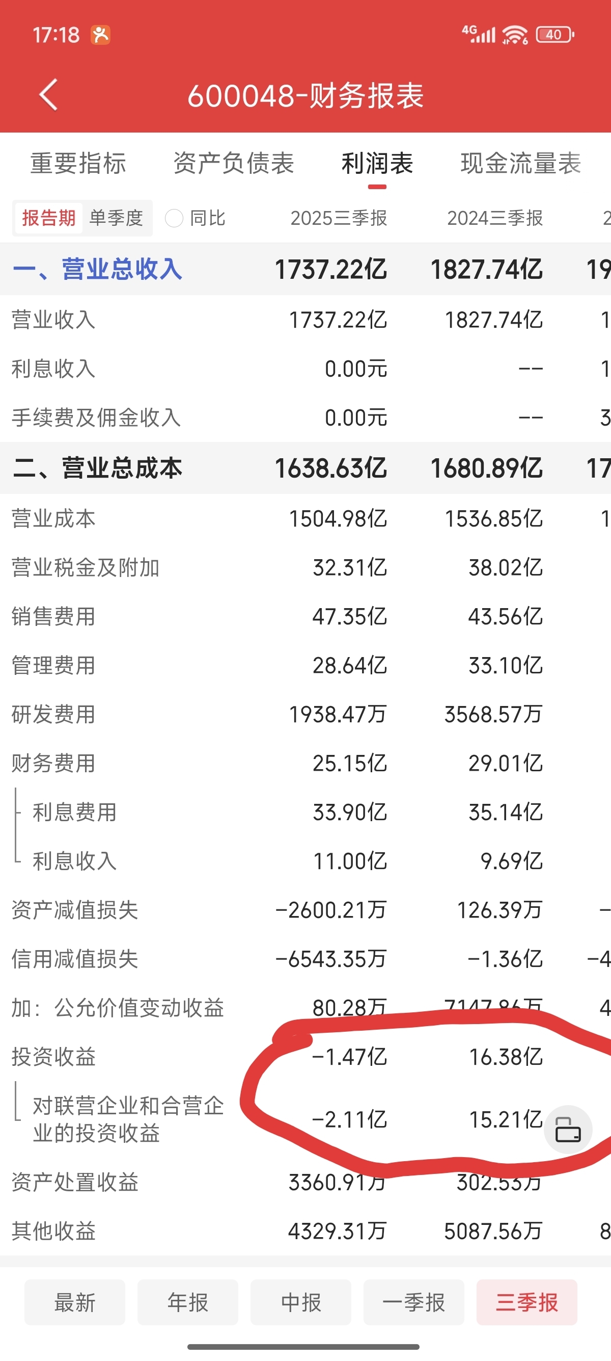 我看了下业绩报表,亏损的主要原因就是投资性收益去年2024年三季度是盈利了15亿