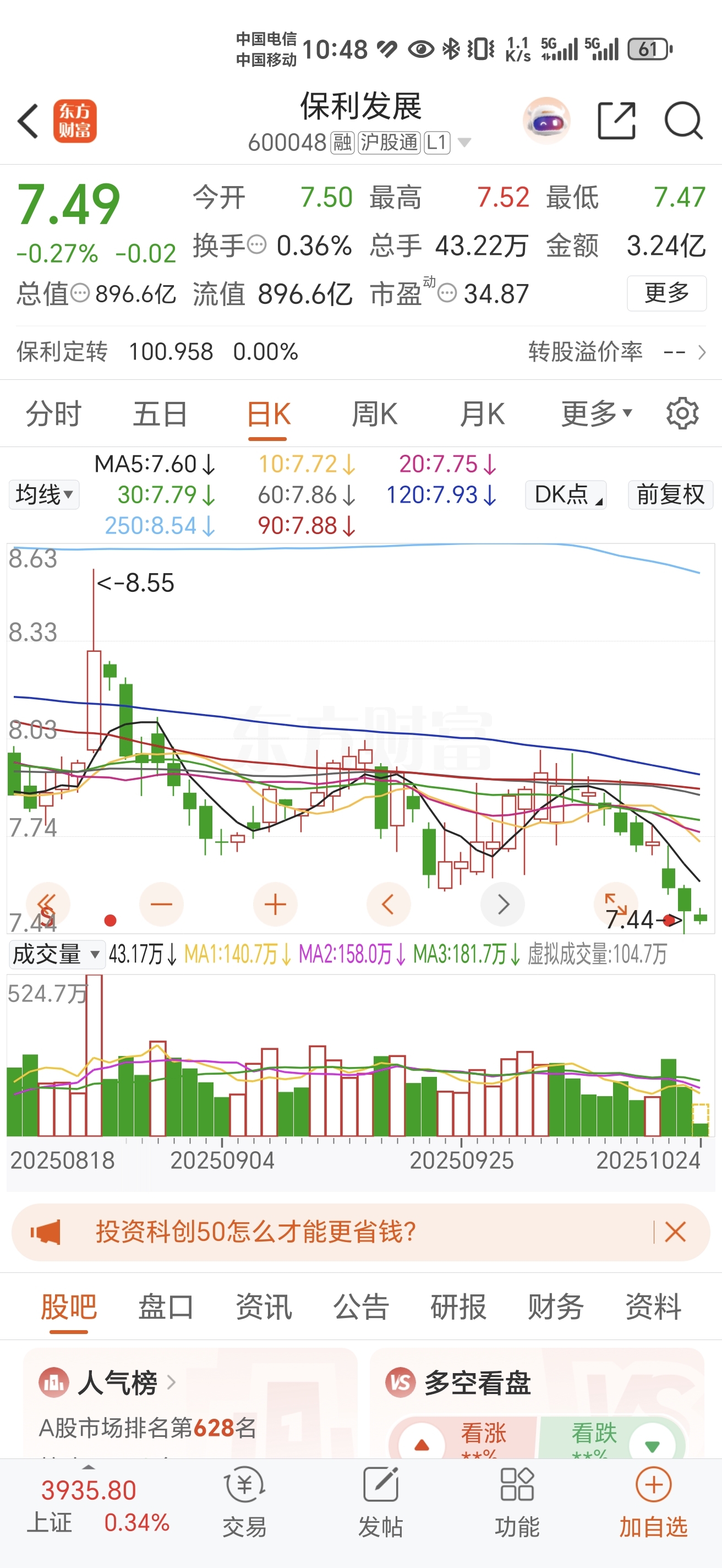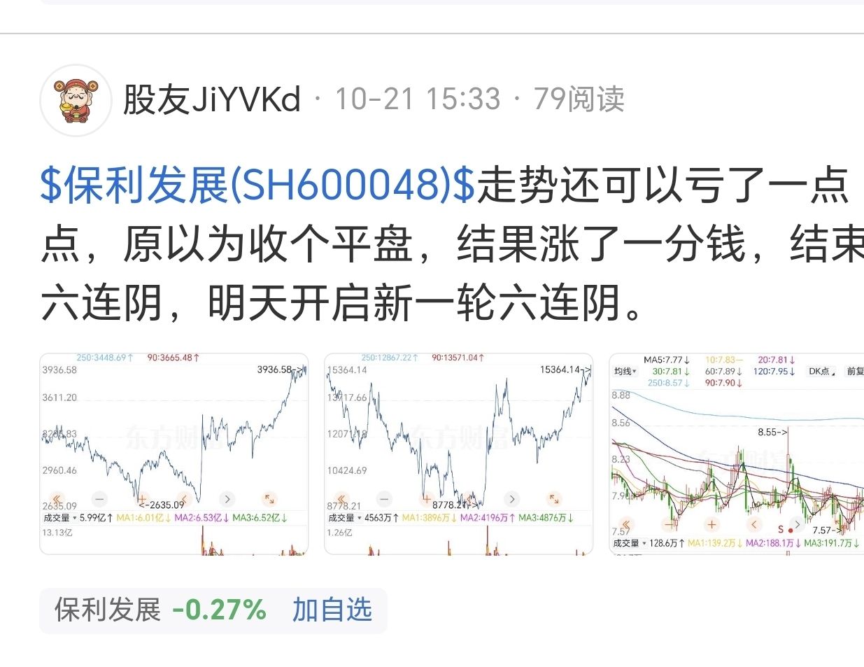 $保利发展(SH600048)$ 还早今天才第三根阴线,周二那天强势上涨一分钱我就说过新一轮六连阴即将开启。
