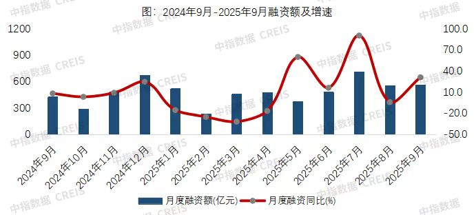 中指研究院数据显示,2025年9月,房地产行业债券融资总额为561.0亿元,同比增长31.0%。其中,房地产行业信用债融资322.0亿元,同比增长89.5%;海外债融资11.4亿元;ABS融资227.7亿元,同比下降11.9%。