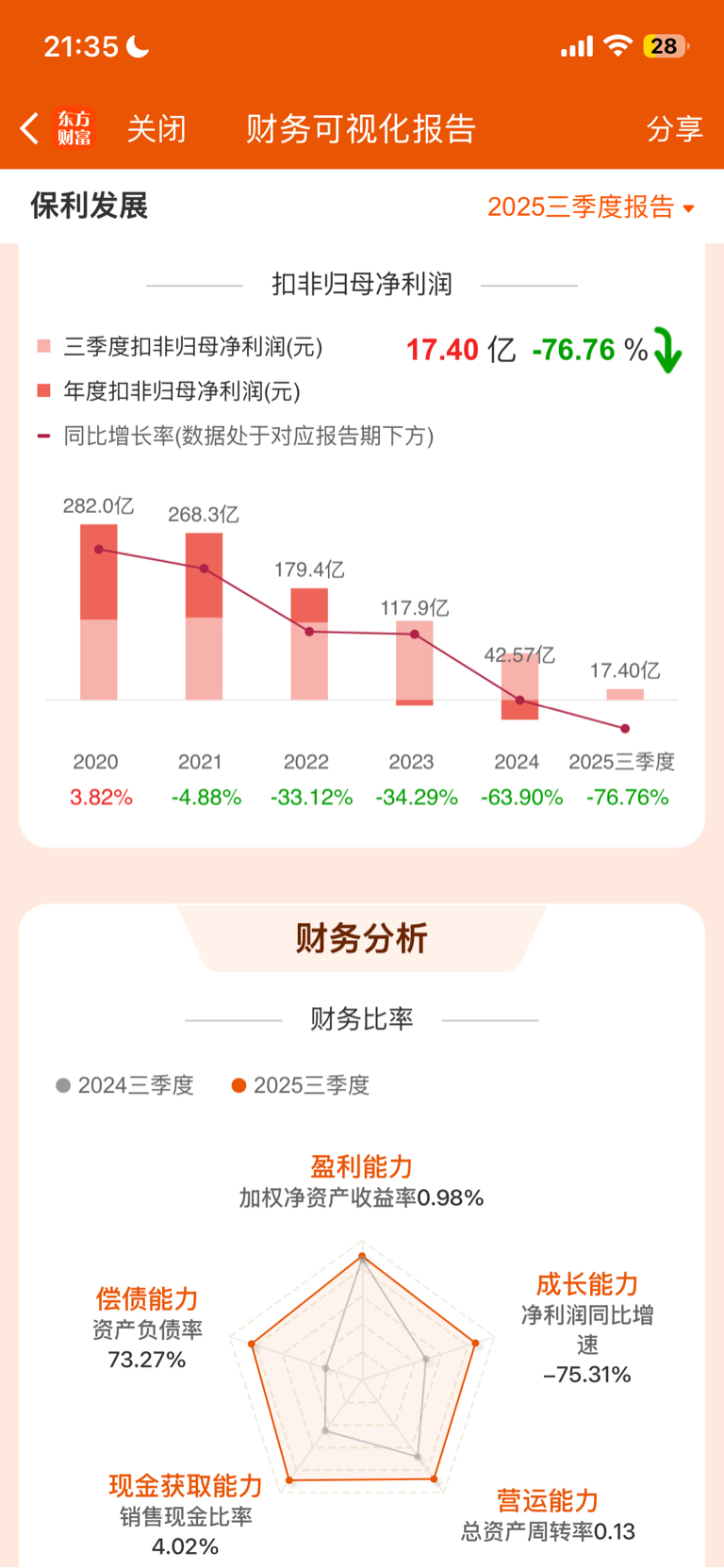 $保利发展(SH600048)$ 这个下滑速度,明年就得开始亏损!3年后st!