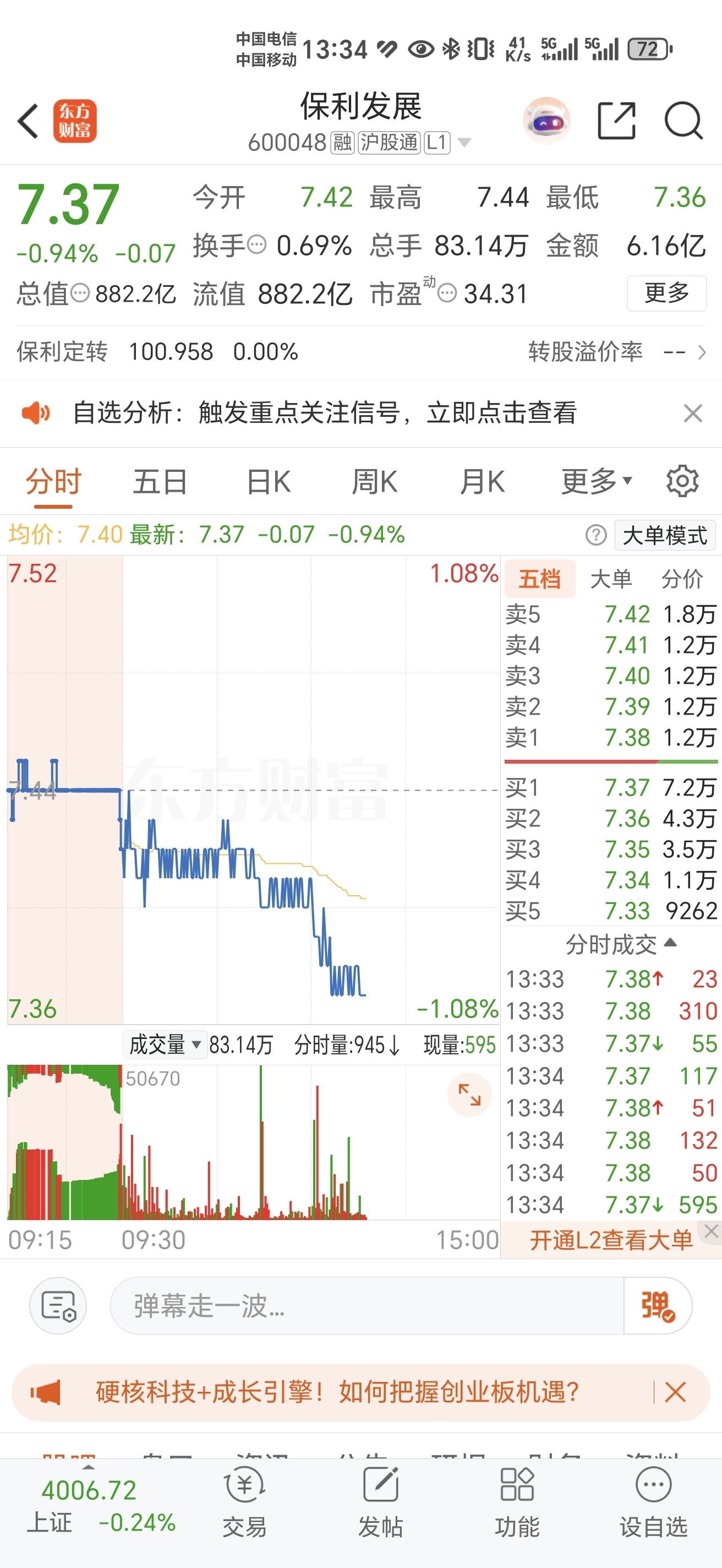 大盘马上翻红,保利发展继续创新低,散户们加油抄底,本月明天还有一天,争取跌破7块