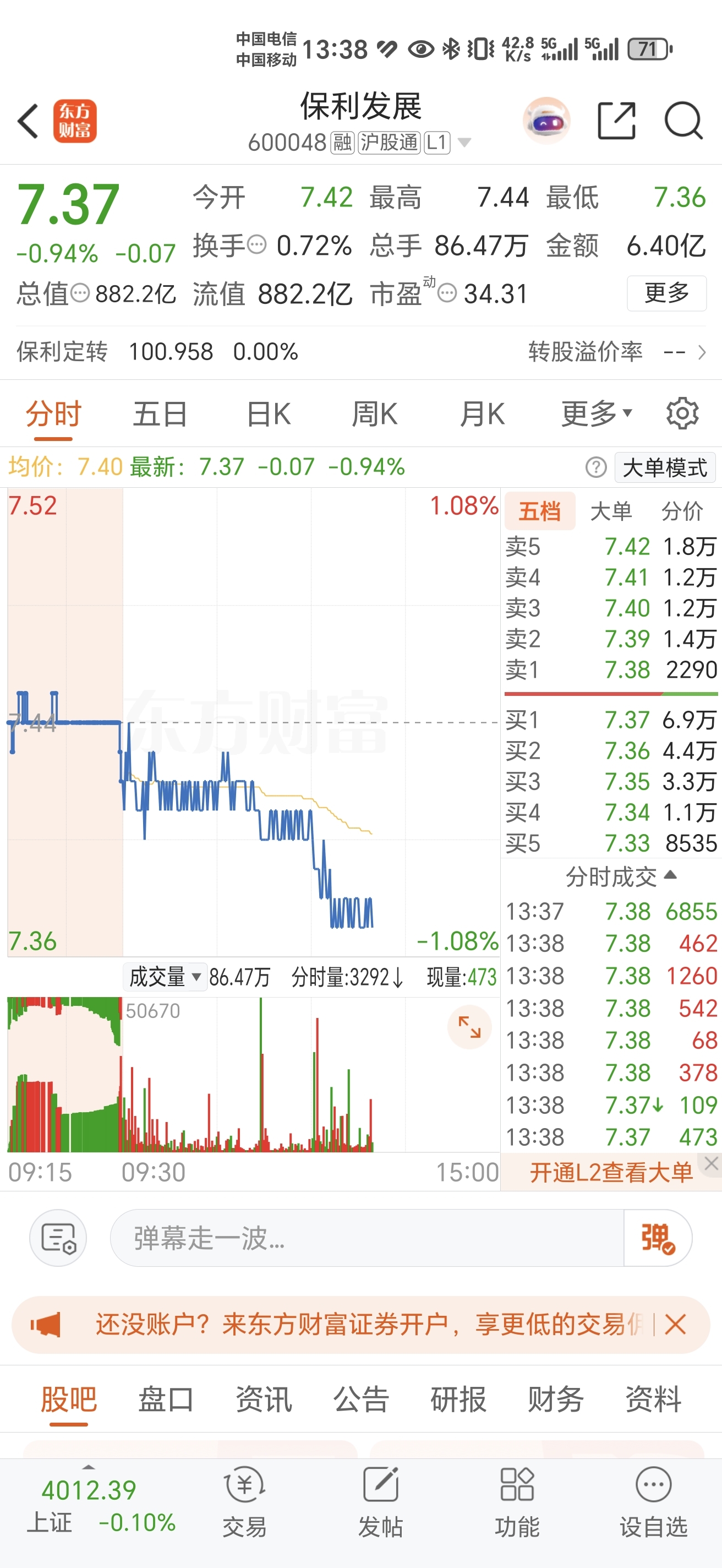 $保利发展(SH600048)$ 漂亮大盘起飞,这里挖一个坑,明天大盘暴力上涨,保利发展明天必须跌破7块。