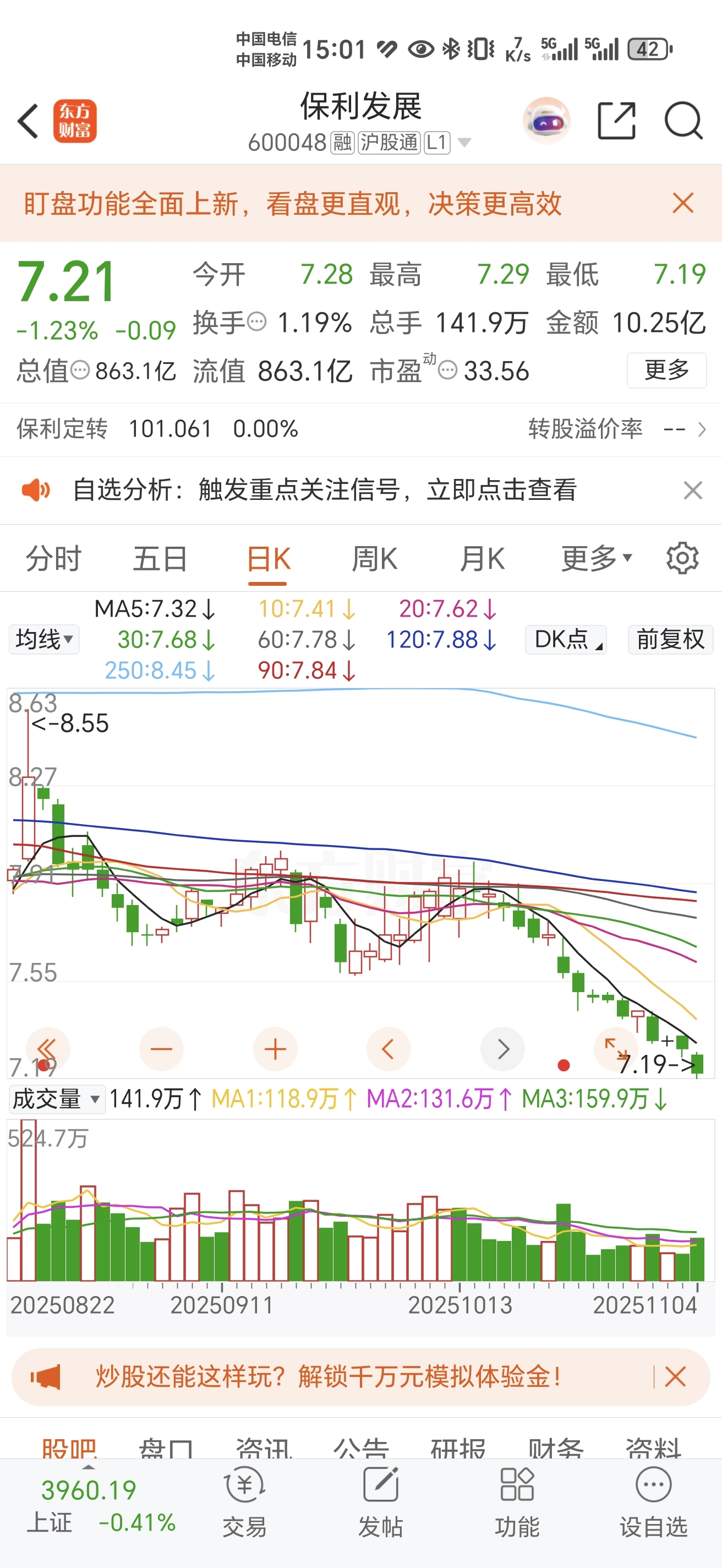 $保利发展(SH600048)$ 今天判断失误没有跌破7.13,大盘尾盘翘尾,三倍做空今天还行4个点收益,散户们放心明天不会跌,天天跌上面有人管,明天会涨一分钱,后天继续跌。