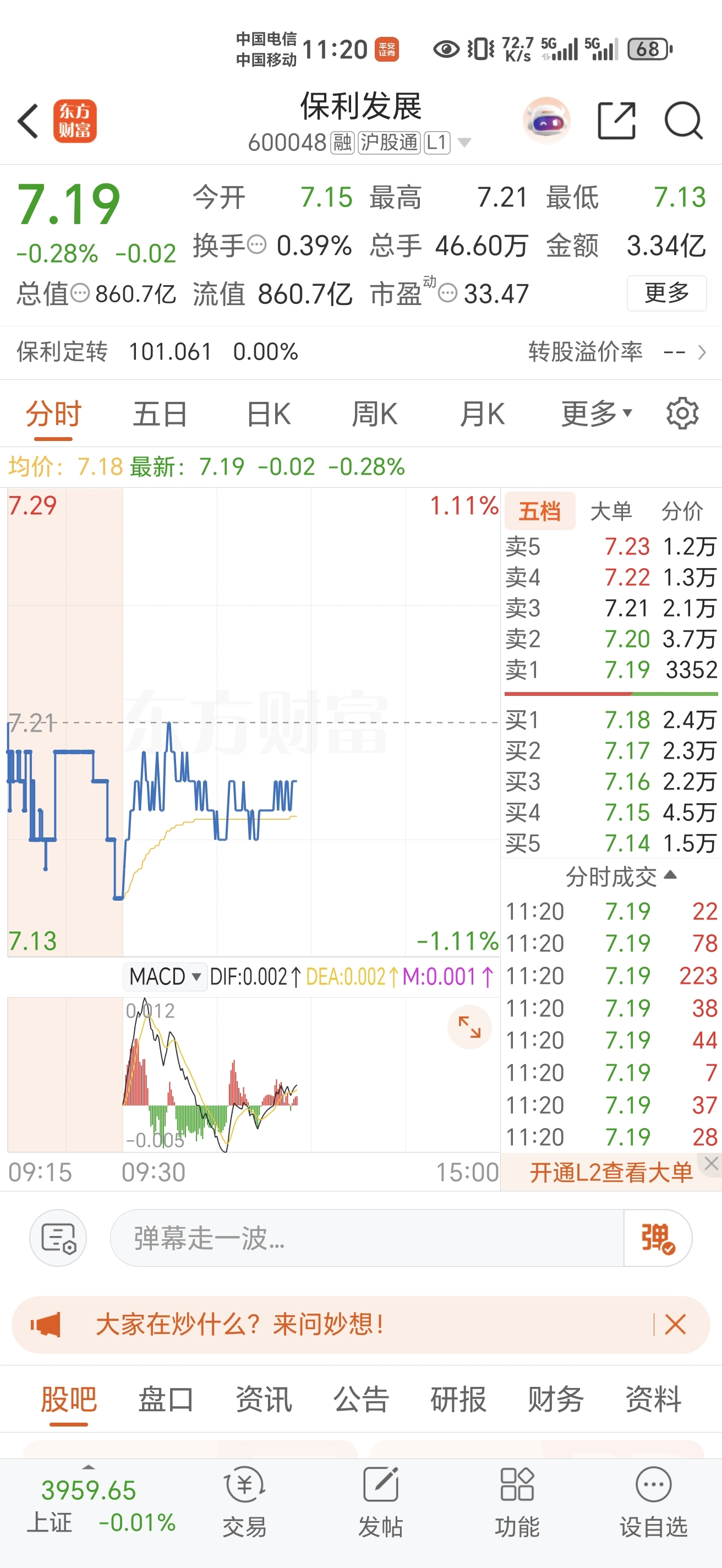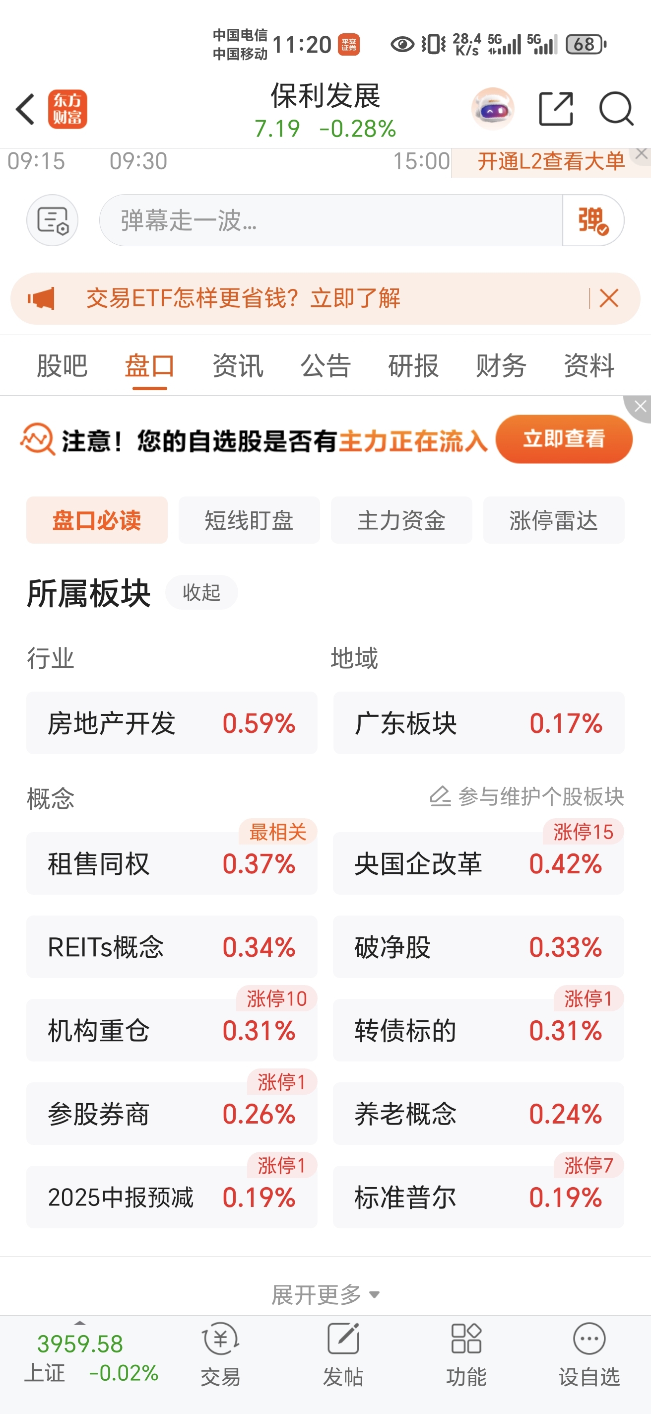 $保利发展(SH600048)$ 漂亮,大盘板块开始起飞,保利发展速度跳水。散户已经开始进场,主力们借助大盘反弹速度出货。