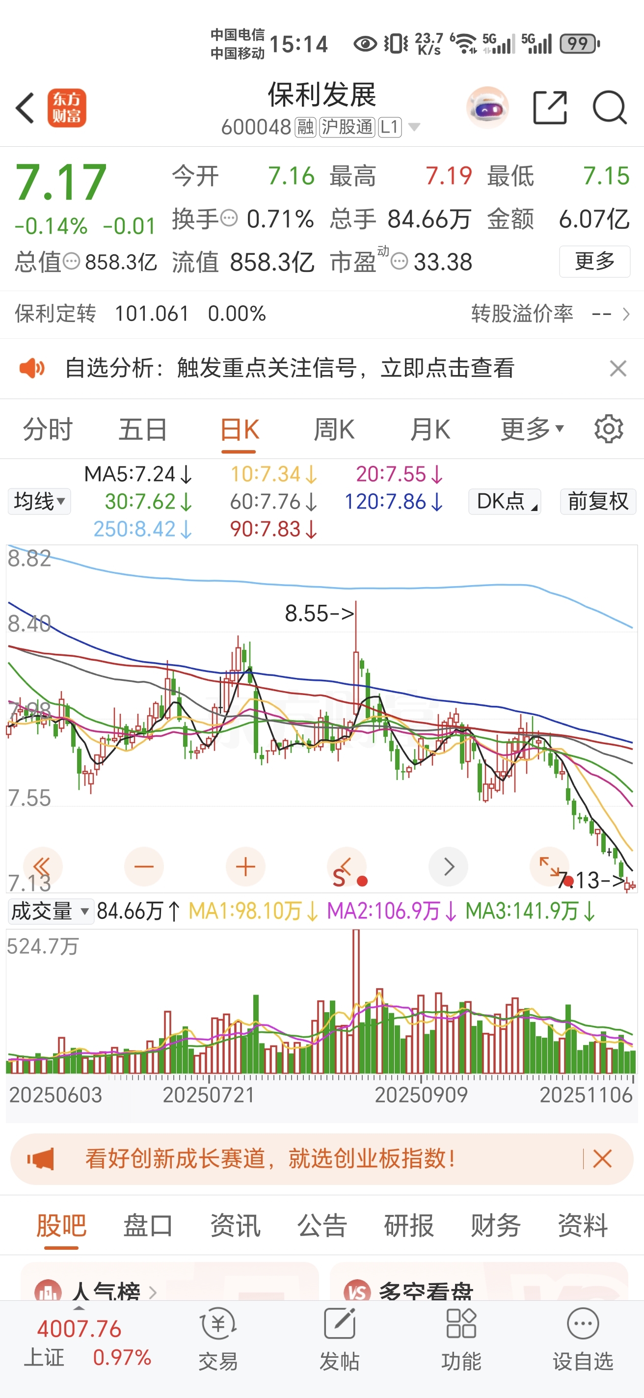 今天大盘涨1%,保利都能绿感谢主力们持续做空,明天大盘回调保利至少跌1%。哈哈散
