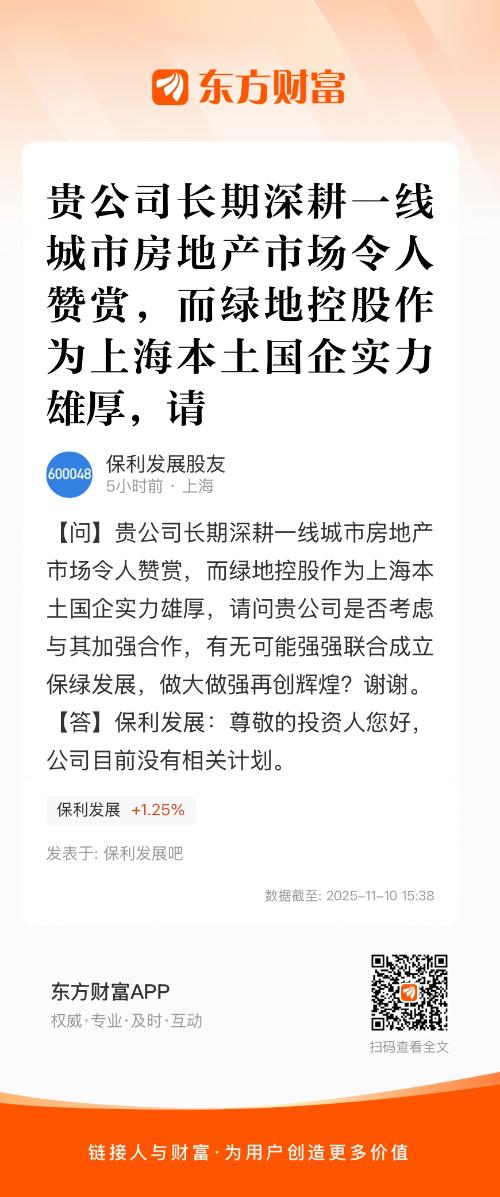 贵公司长期深耕一线城市房地产市场令人赞赏,而绿地控股作为上海本土国企实力雄厚,请问贵公司是否考虑与其加强合作,有无可能强强联合成立保绿发展,做大做强再创辉煌?谢谢。