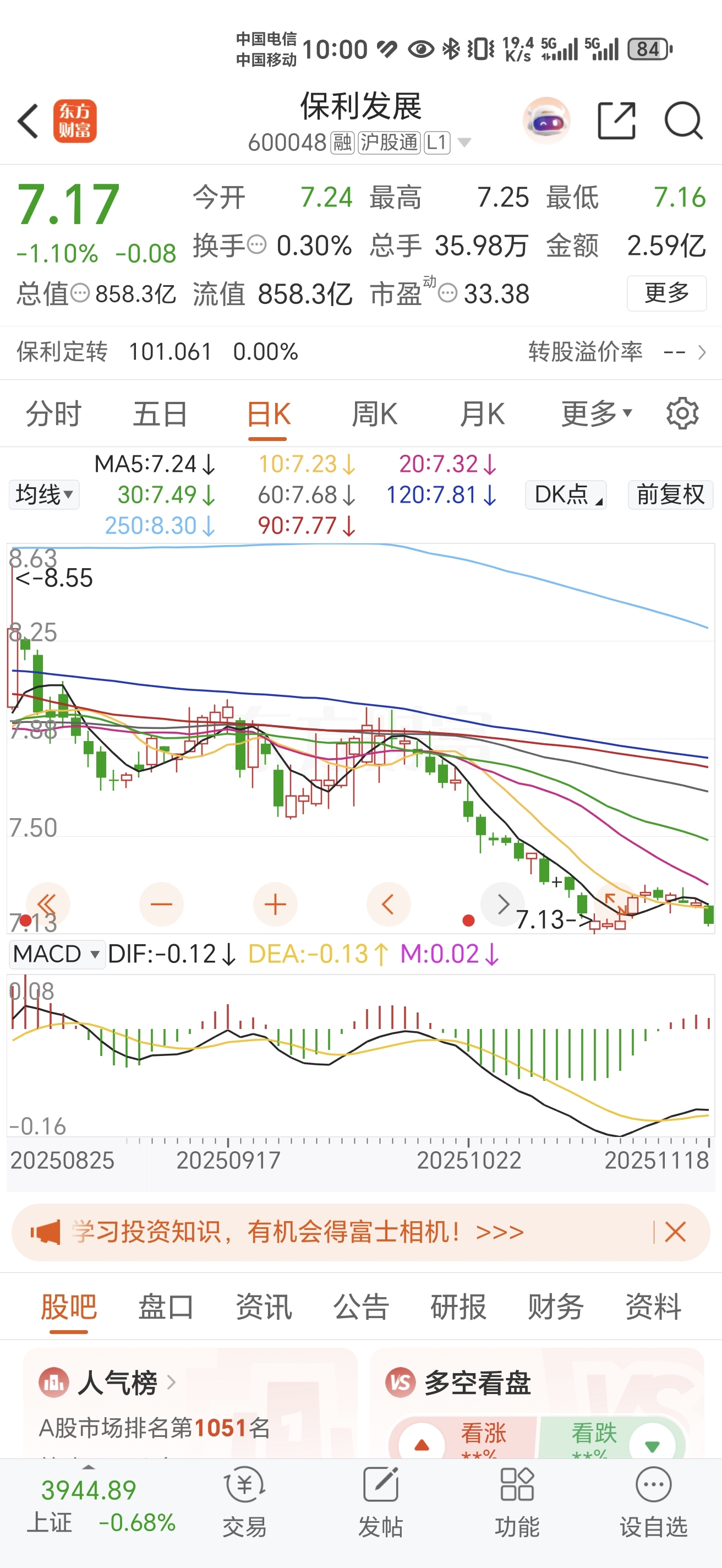 漂亮,昨天才说了房地产板块要回调今天就开始了,今天争取跌破7.13,本周跌破7块