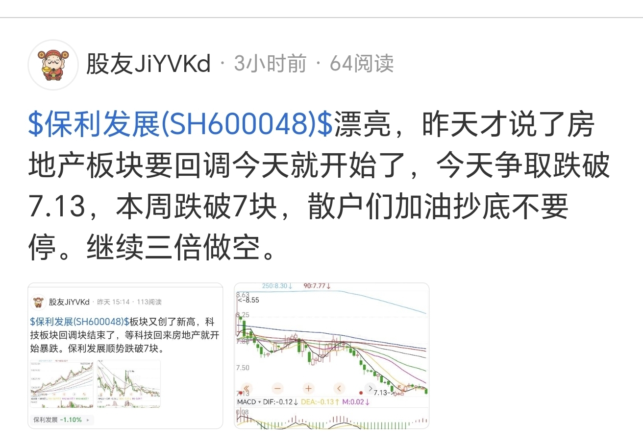 $保利发展(SH600048)$ 漂亮符合预期,第一目标位已破,下一目标位6.6。散户们继续抄底。