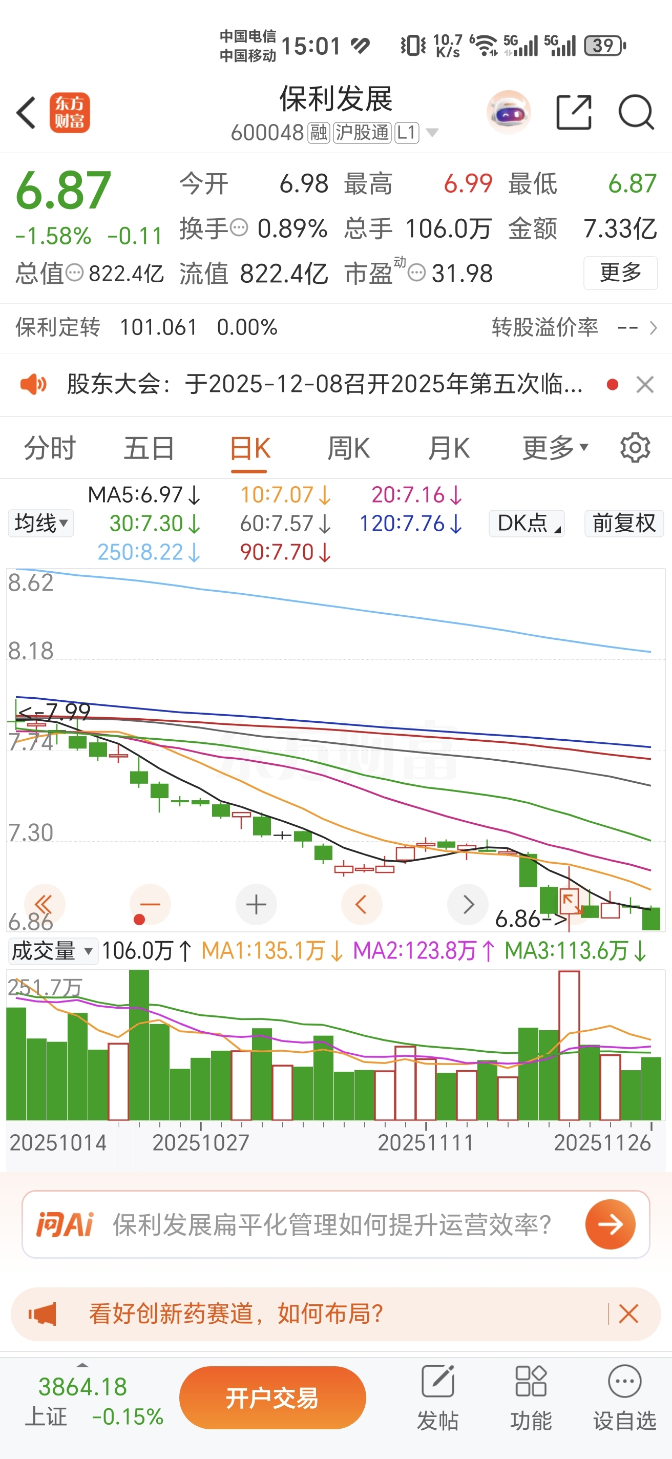 $保利发展(SH600048)$ 漂亮放量最低点收盘,明天开盘跌破6.86。这几天抄底的散户三年别想解套哈哈,继续三倍做空保利发展。散户们明天继续抄底
