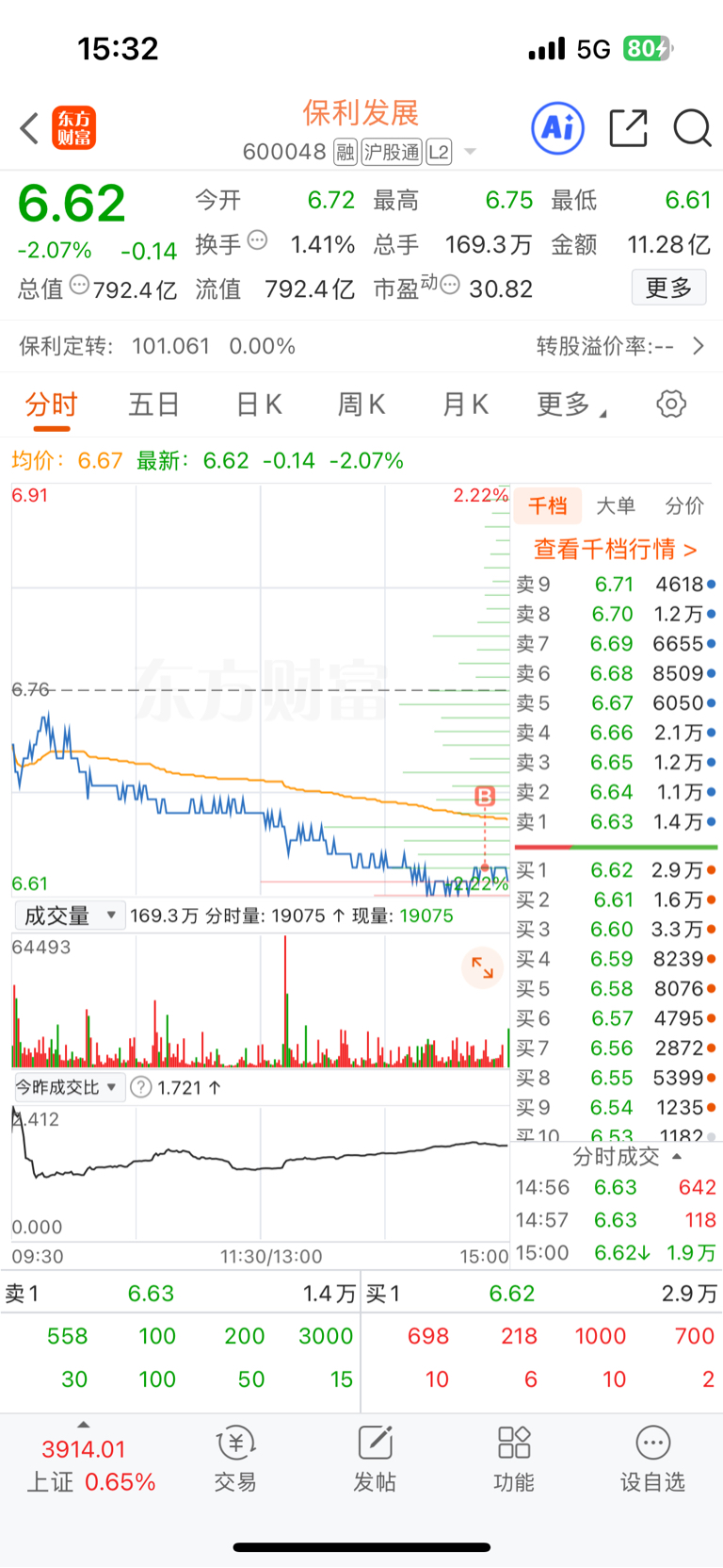 $保利发展(SH600048)$ 今天尝试抄底一波,止损线1%,亏1%走人