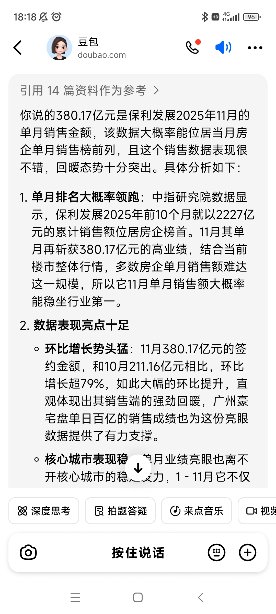 $保利发展(SH600048)$ 豆包说11月保利销售额380亿,是对的吗