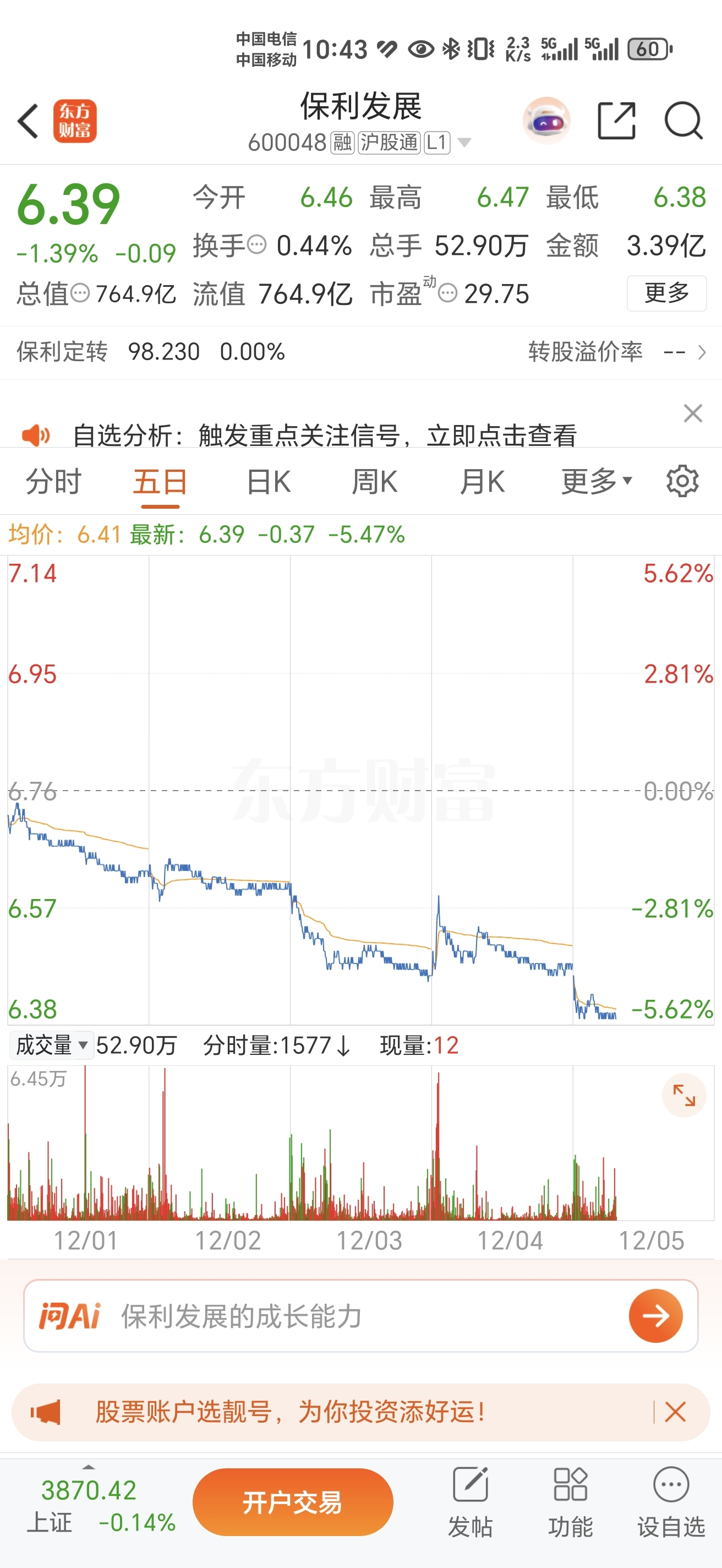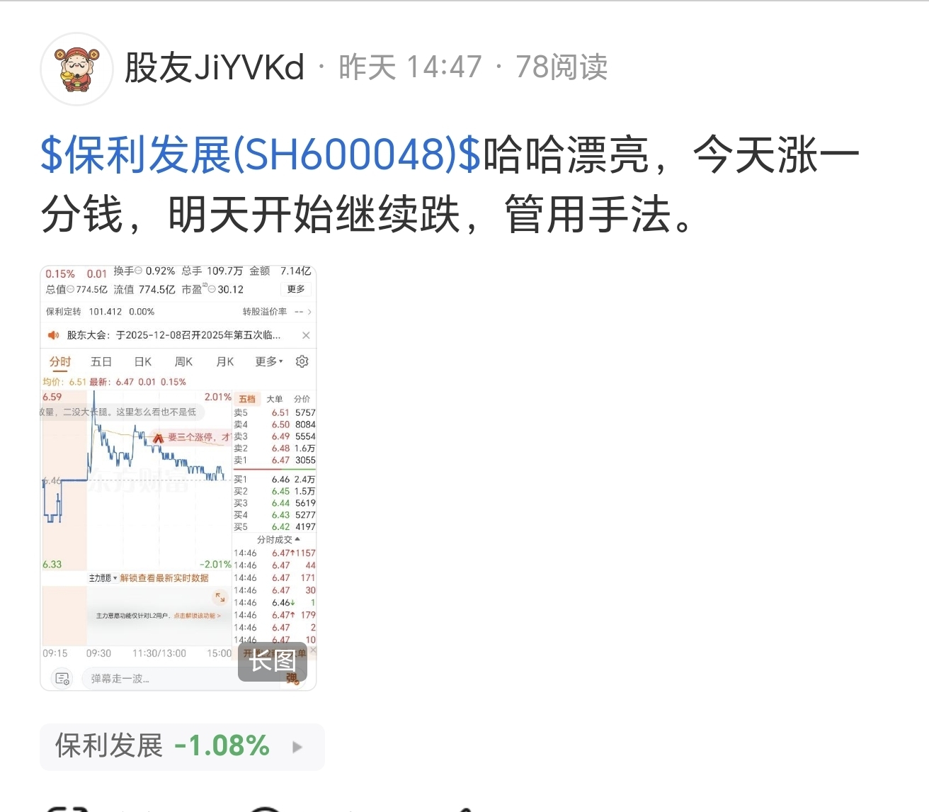 $保利发展(SH600048)$ 干的漂亮符合预期,昨天涨两个点你们不走,今天跌两个点,这波操作主力干的漂亮,12号之前跌破5块。今天争取跌破6块,散户们继续抄底,还有二十个点跌幅。