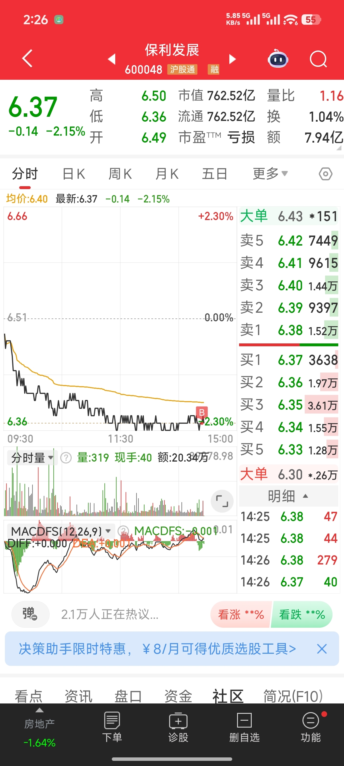 加仓保利发展,加不动了。