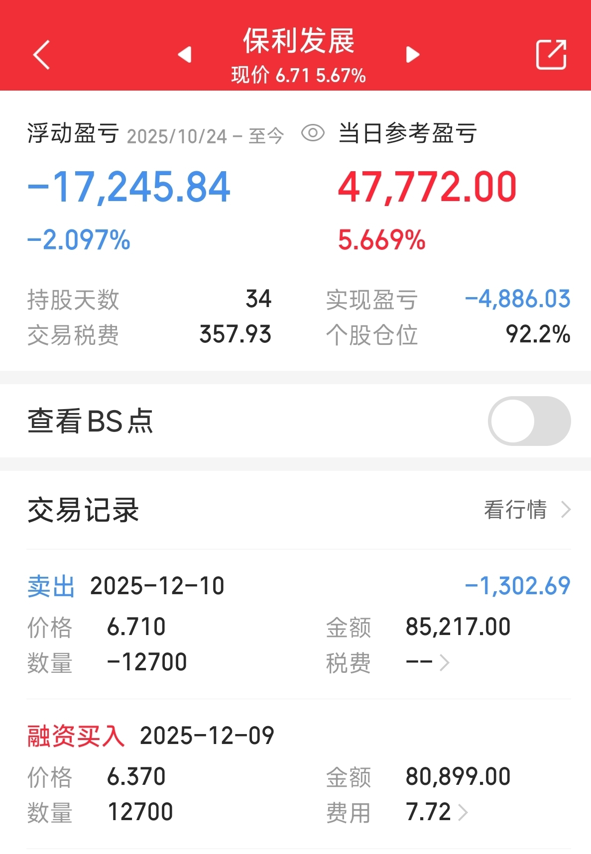 $保利发展(SH600048)$ 昨天加仓的部分,出掉!