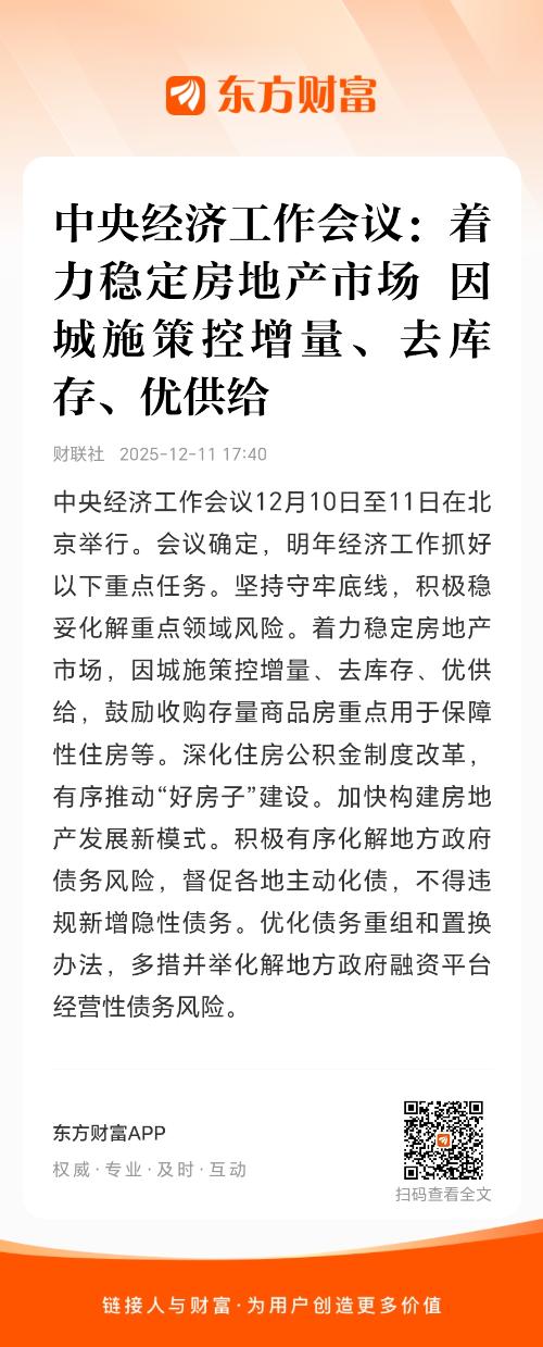 中央经济工作会议12月10日至11日在北京举行。会议确定,明年经济工作抓好以下重点任务。坚持守牢底线,积极稳妥化解重点领域风险。着力稳定房地产市场,因城施策控增量、去库存、优供给,鼓励收购存量商品房重点用于保障性住房等。深化住房公积金制度改革,有序推动“好房子”建设。加快构建房地产发展新模式。积极有序化解地方政府债务风险,督促各地主动化债,不得违规新增隐性债务。优化债务重组和置换办法,多措并举化解地方政府融资平台经营性债务风险。