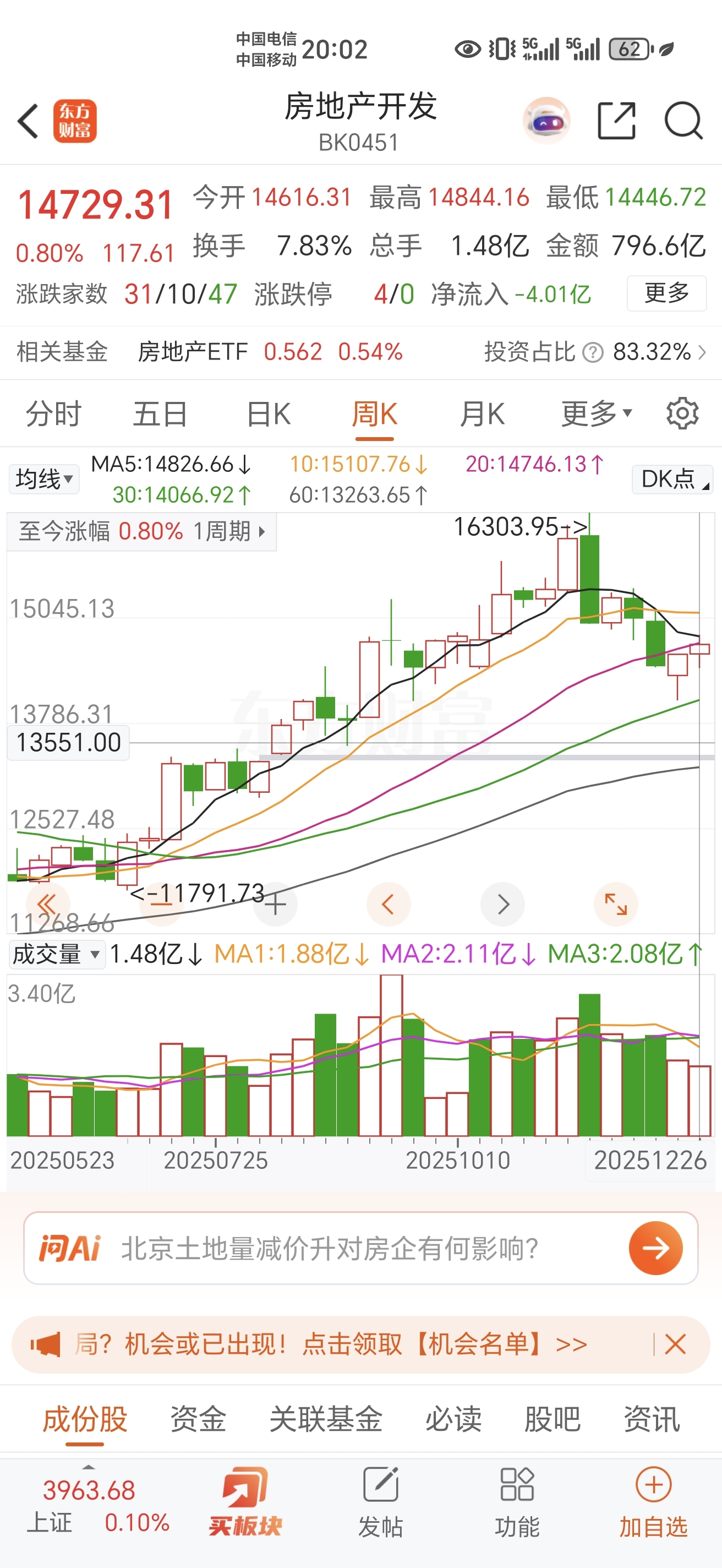 本周上证指数上涨2%,房地产板块上涨1%保利发展下跌1%。下周还有三个交易日,希