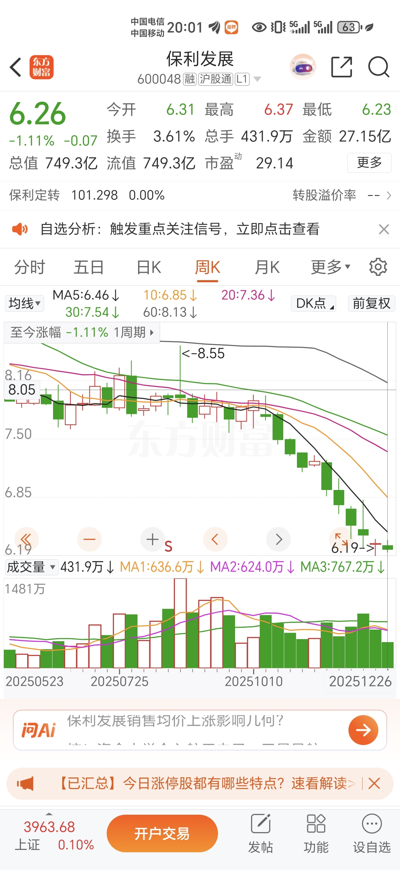 $保利发展(SH600048)$ 本周上证指数上涨2%,房地产板块上涨1% 保利发展下跌1%。下周还有三个交易日,希望保利顺利跌破6块,主力们下周加大做空力度。