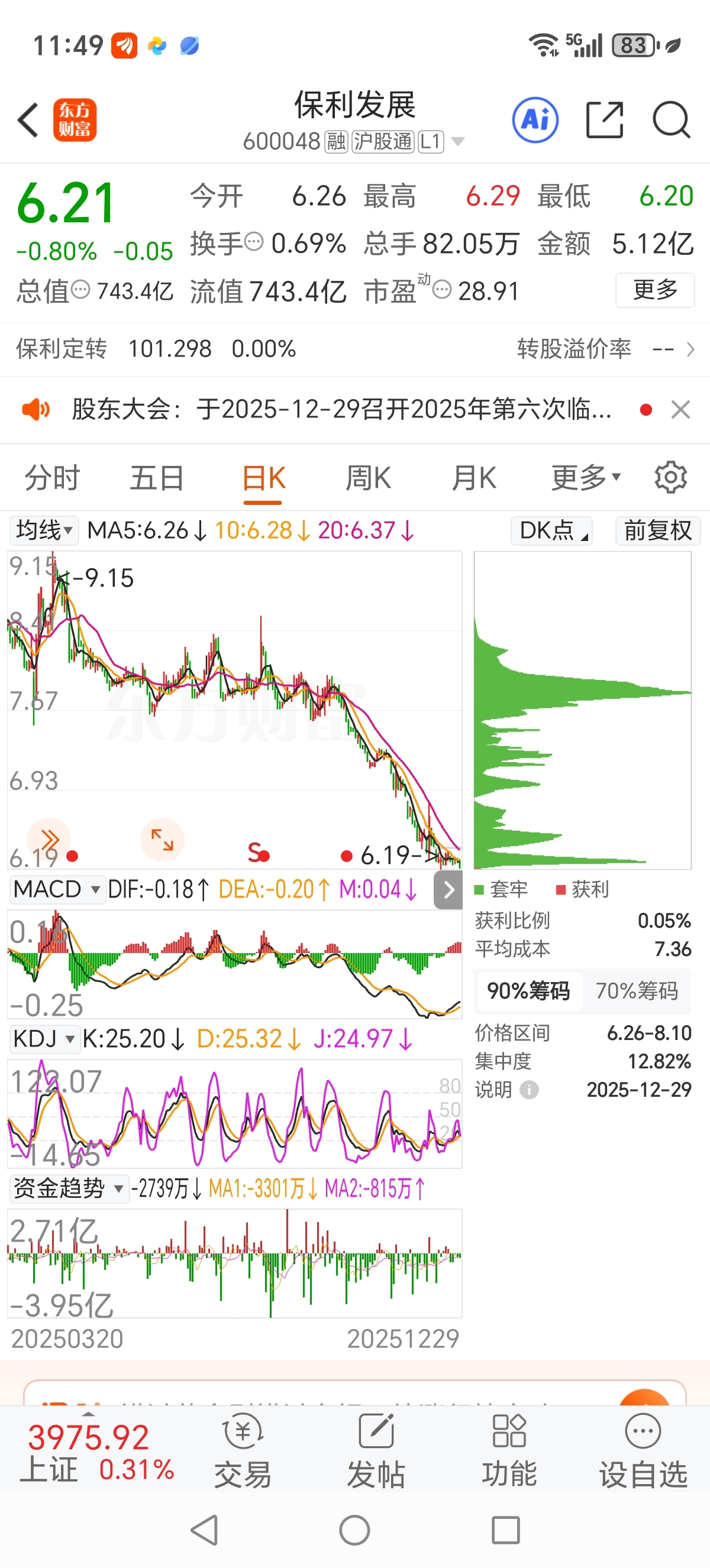 上证指数从年头涨到年尾,保利股份从年头跌到年尾,亏损的股票都没有跌到这么低,不知