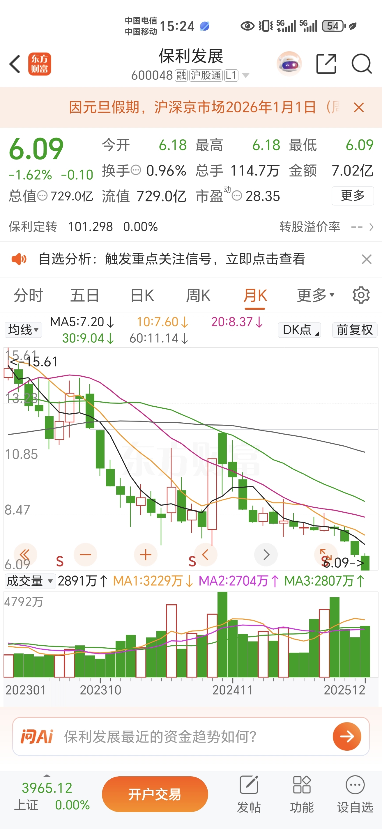 $保利发展(SH600048)$ 大盘相当稳,明天突破4000点创新高,保利发展跌破6块创新低。