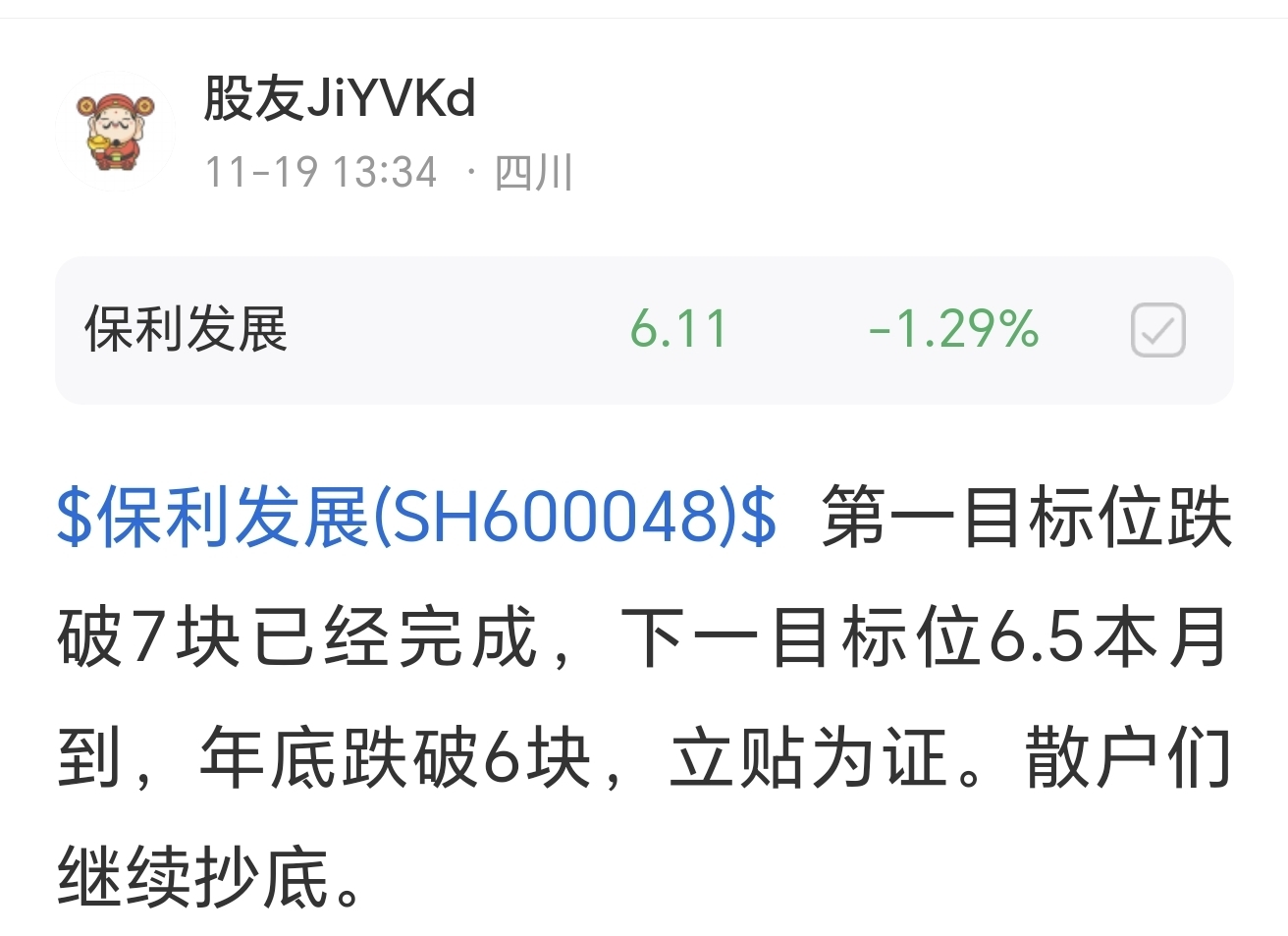 $保利发展(SH600048)$ 漂亮,吓唬谁呢,想骗我接盘不可能,今天必破6块,一月底破5块,明年年底3块立贴为证,散户速度抄底。