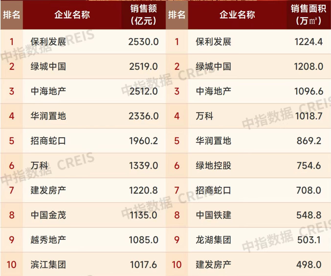 12月31日,中指研究院、克而瑞、亿翰智库等机构发布2025年房地产企业业绩。据中指研究院,保利发展、绿城中国、中海地产、华润置地4家房企全年销售额均超2000亿元。其中,保利发展2530亿元、绿城中国2519亿元、中海地产2512亿元、华润置地2336亿元。
