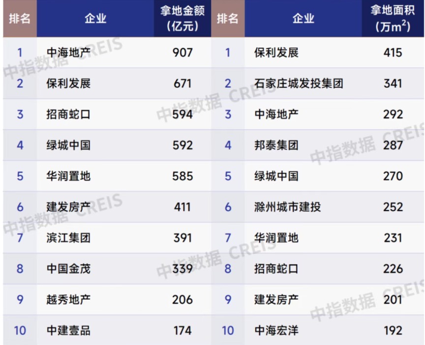保利发展、华润置地、中海地产、招商蛇口、建发房产等8家房企拿地金额超300亿元。