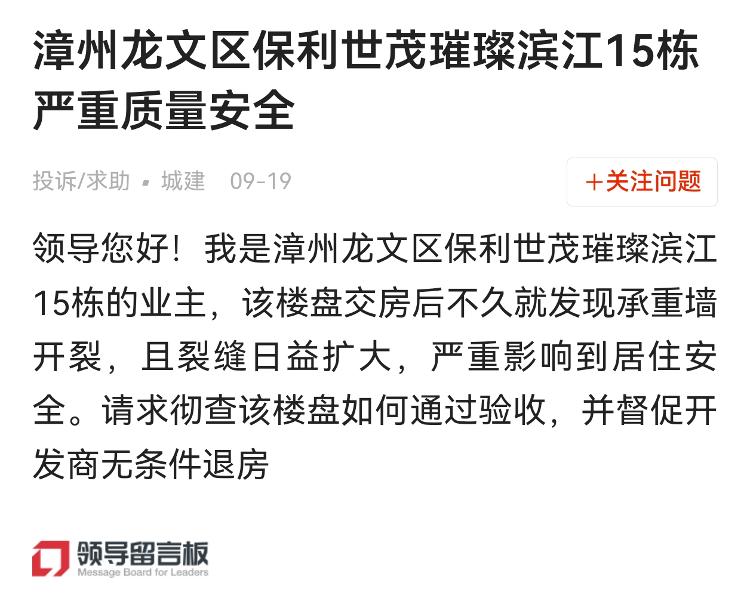 近期,人民网领导留言板有多名自称福建漳州龙文区保利世茂璀璨滨江一期业主的网友留言称,房屋存在“墙面开裂”“钢筋裸露”等问题。