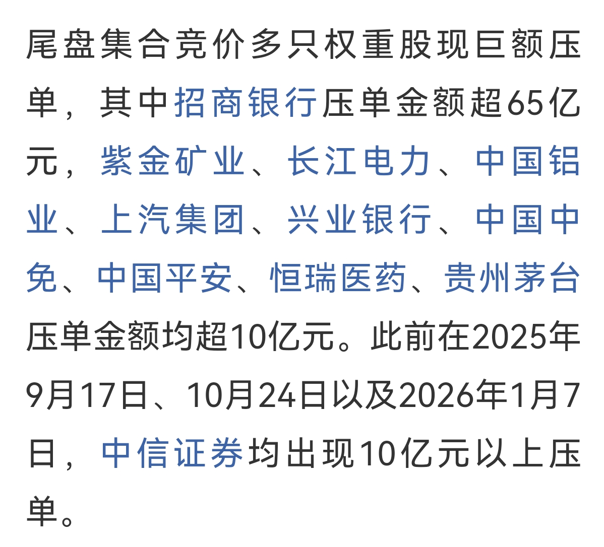 尾盘竞价大压单:招商银行65.72亿,长江电力36.88亿,紫金矿业30.47亿