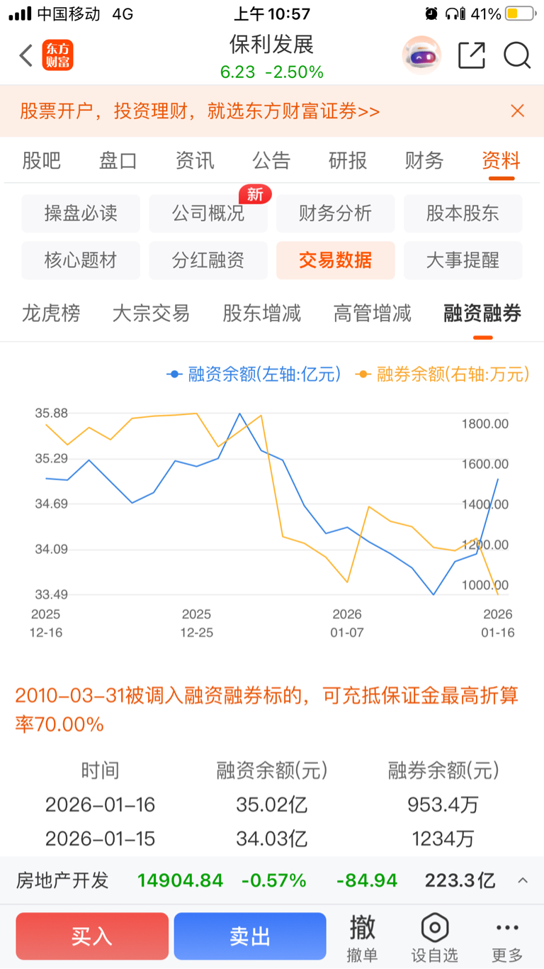 $保利发展(SH600048)$ 周五跌不少,但融资净增1亿,融劵降至1年内新低!