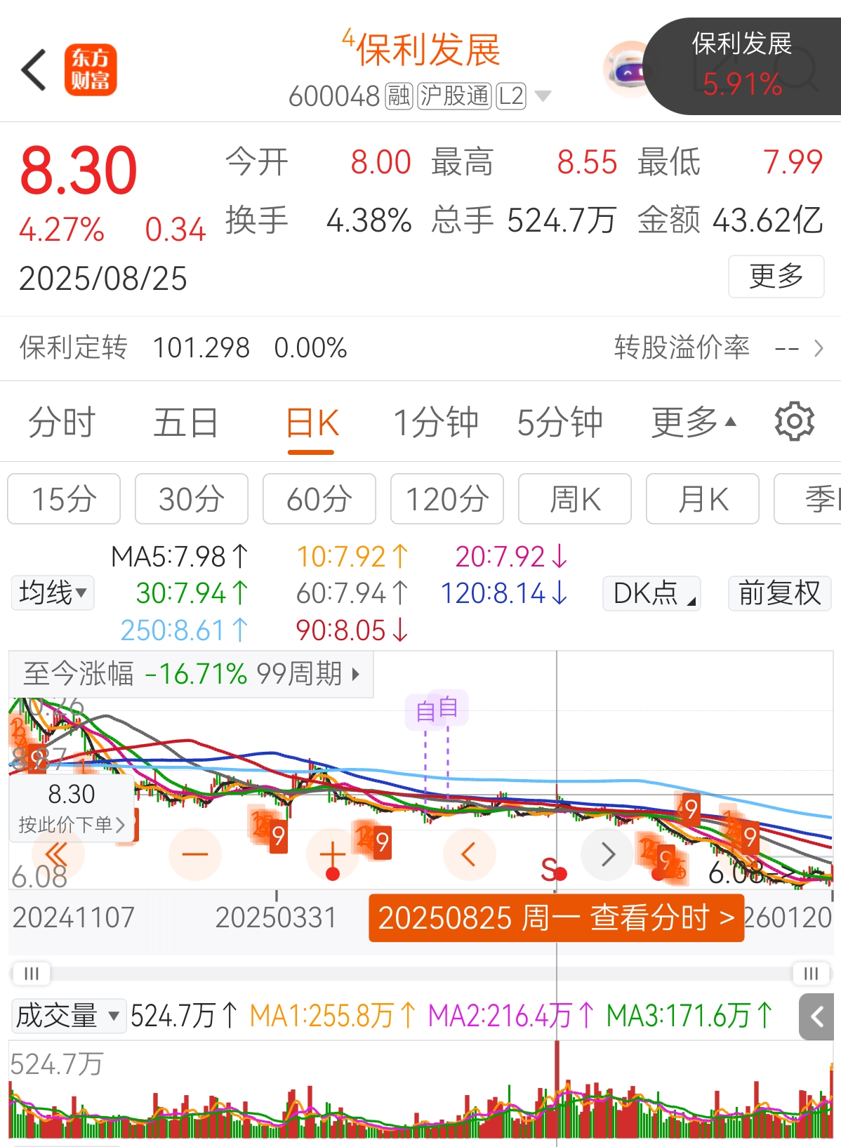 仅次于825那天的量,但当时在8元以上。第2买点出现了!实话说,涨比跌难忍,除非不盯盘,越盯越想卖。$保利发展(SH600048)$
