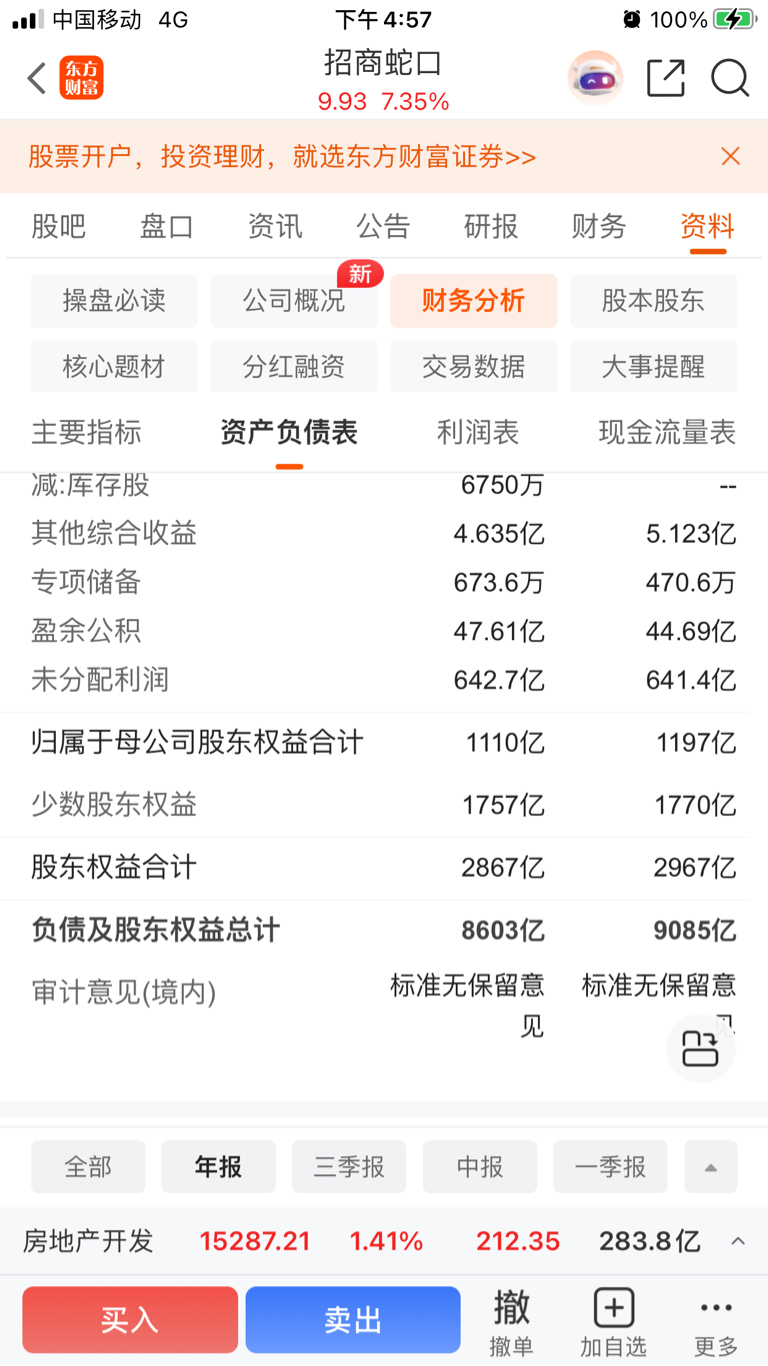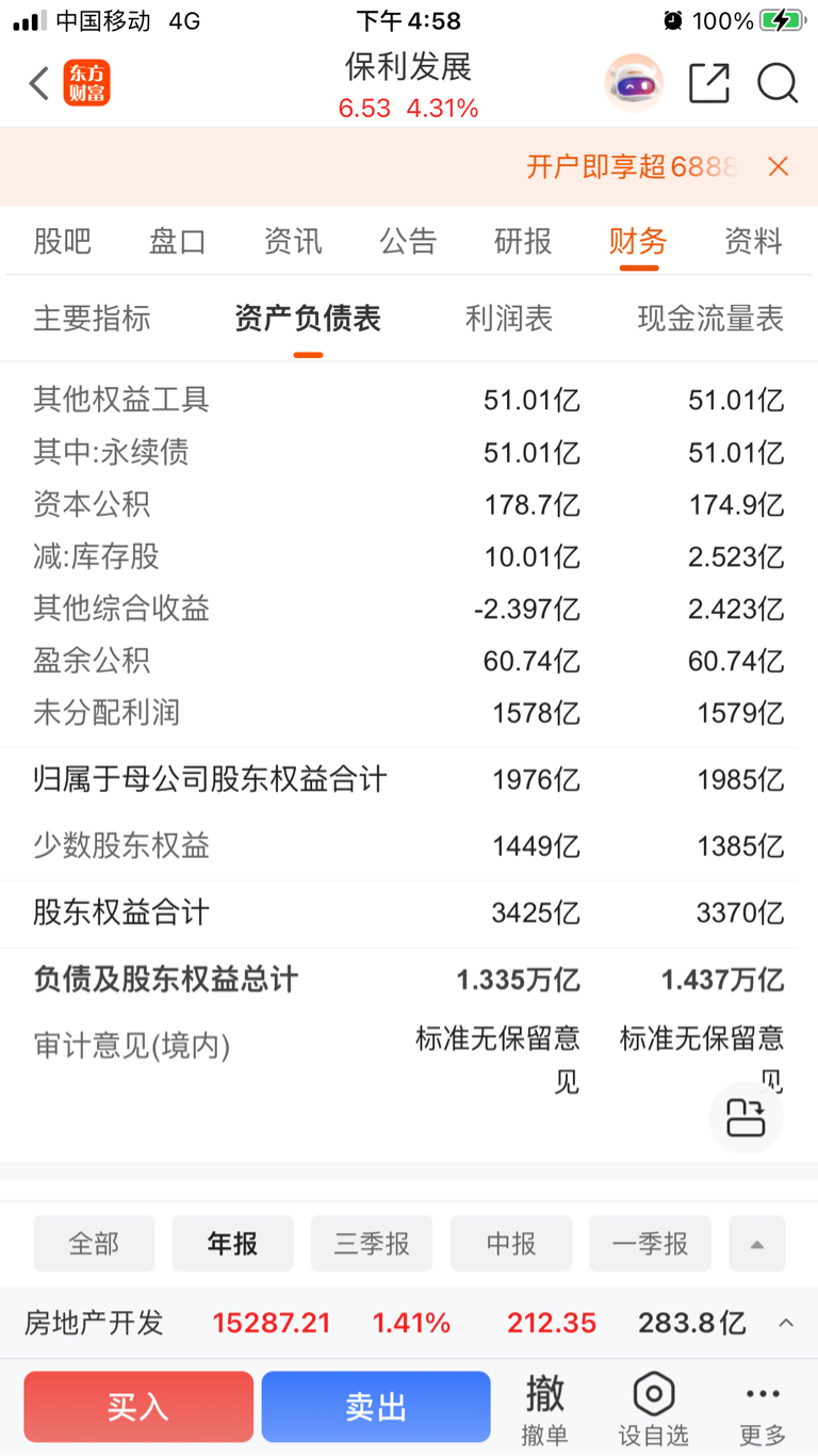 $保利发展(SH600048)$ 对比保利、招蛇的归母所有者权益占比:保利为1976/3425=57.69%;招蛇为1110/2867=38.72%。