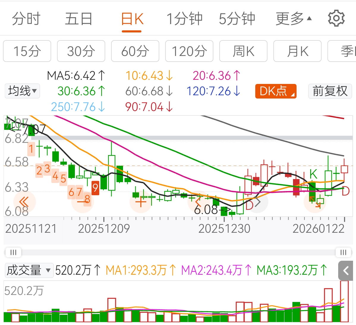 继续上就会先遇到60日线,所以猜明天可能挑战60日线,再大胆点就更上一层,挑战缺口。其实以这个量能,拿下6.82不是问题。$保利发展(SH600048)$